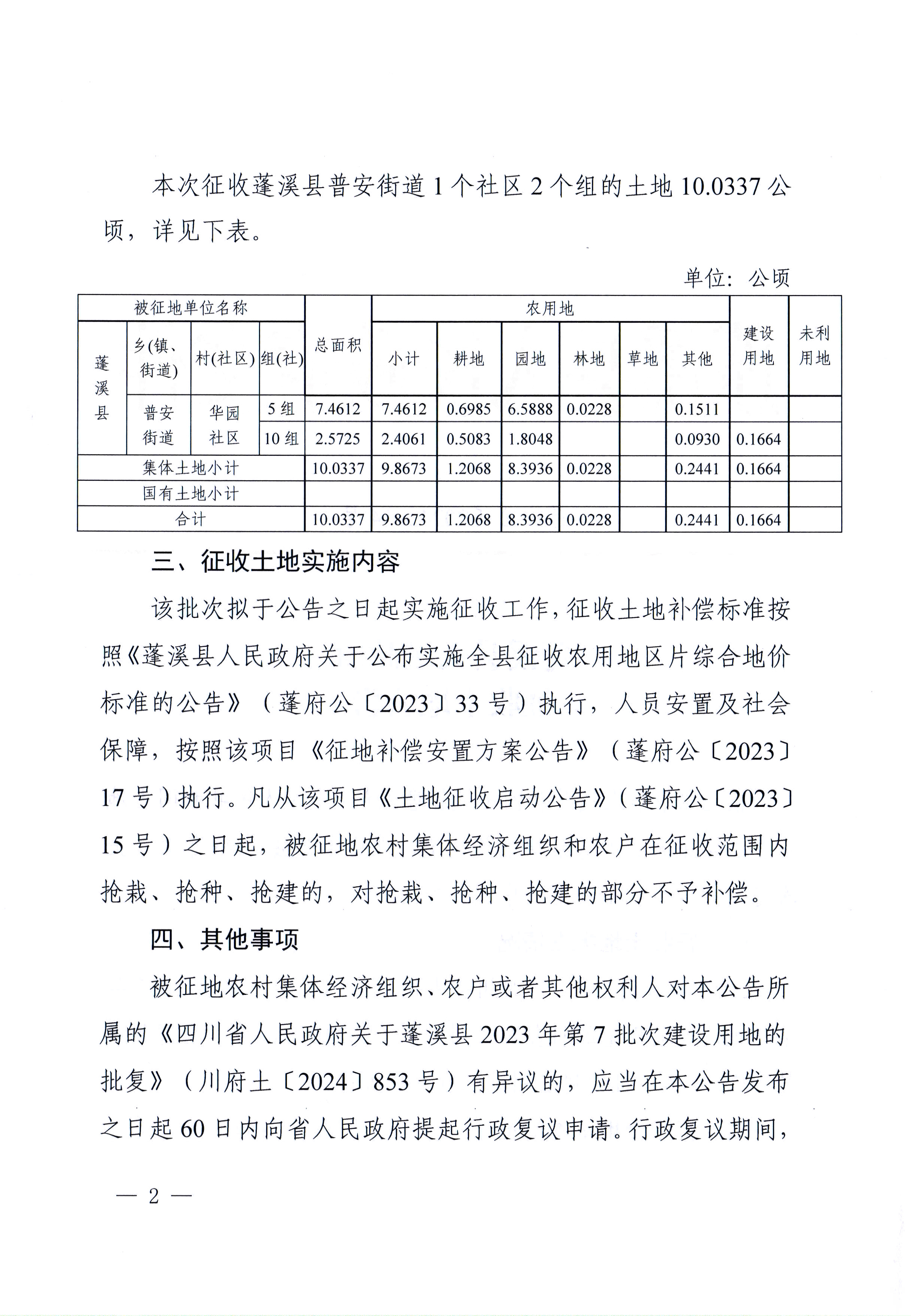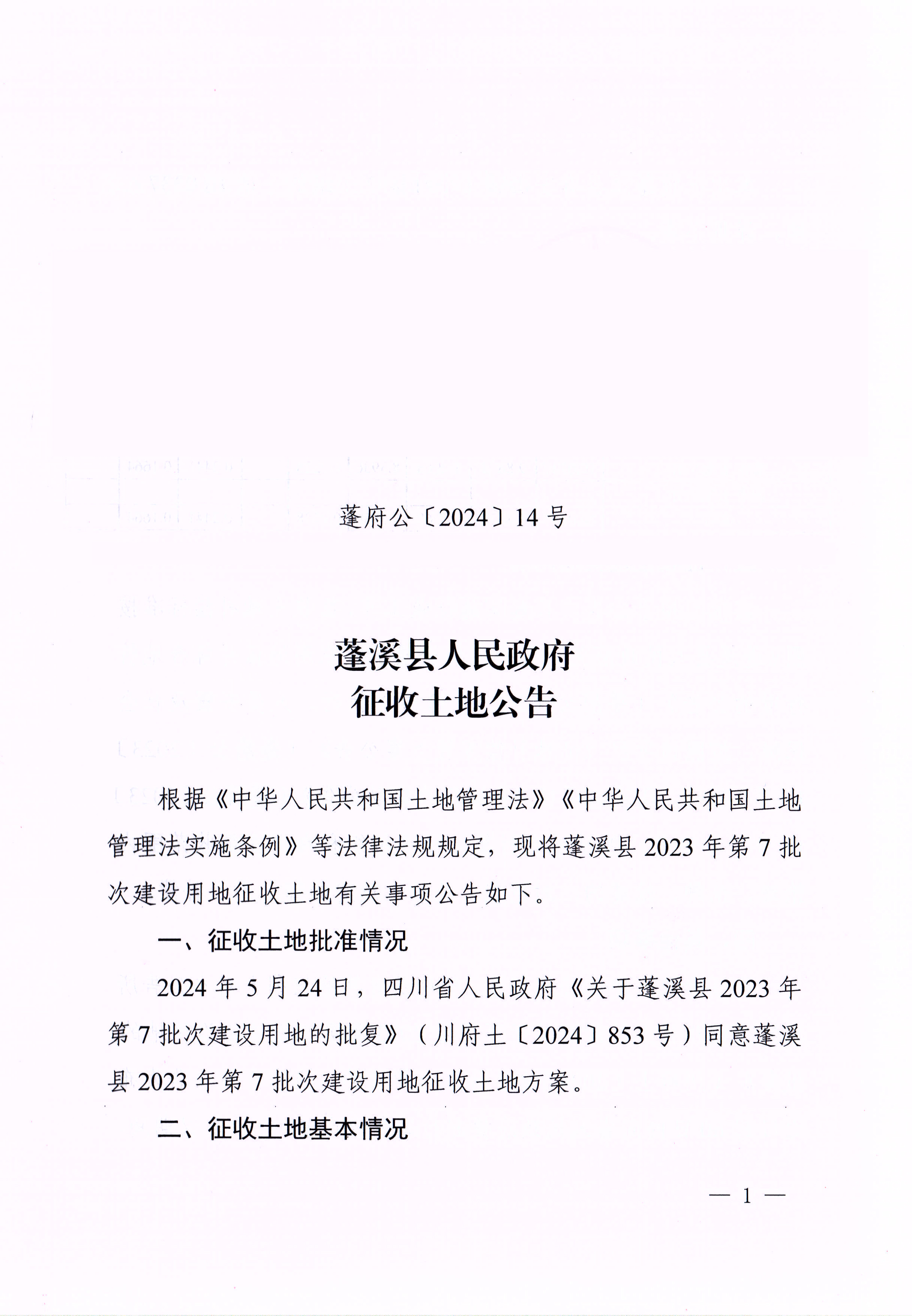 蓬溪县人民政府征收土地公告(蓬府公〔2024〕14号)