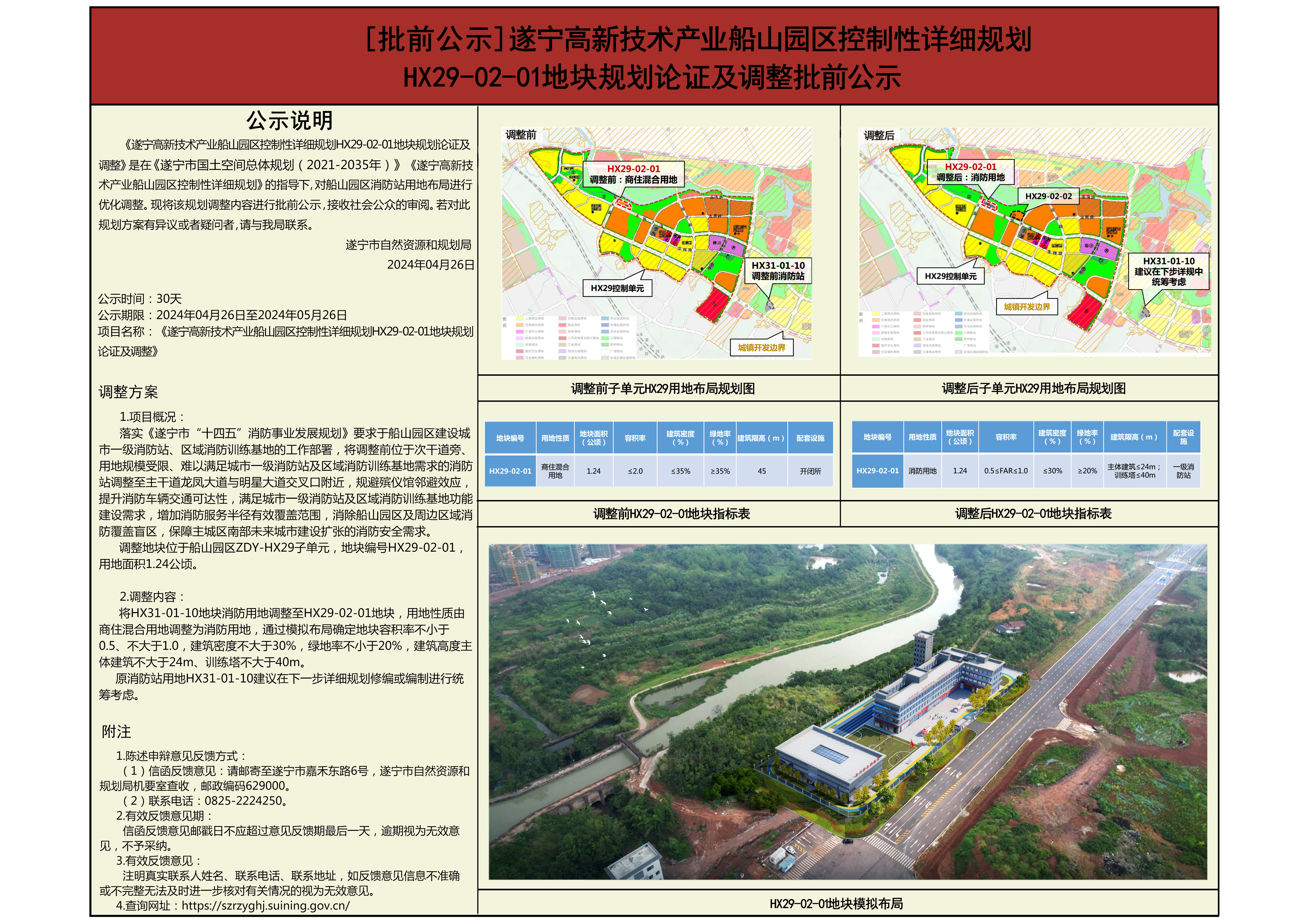 《遂宁高新技术产业船山园区控制性详细规划HX29-02-01地块规划论证及调整》是在《遂宁市国土空间总体规划(2021-2035年)》《遂宁高新技术产业船山园区控制性详细规划》的指导下,对船山园区消防站用地布局进行优化调整。现将该规划调整内容进行批前公示,接受社会公众的审阅。若对此规划方案有异议或者疑问者,请与我局联系。