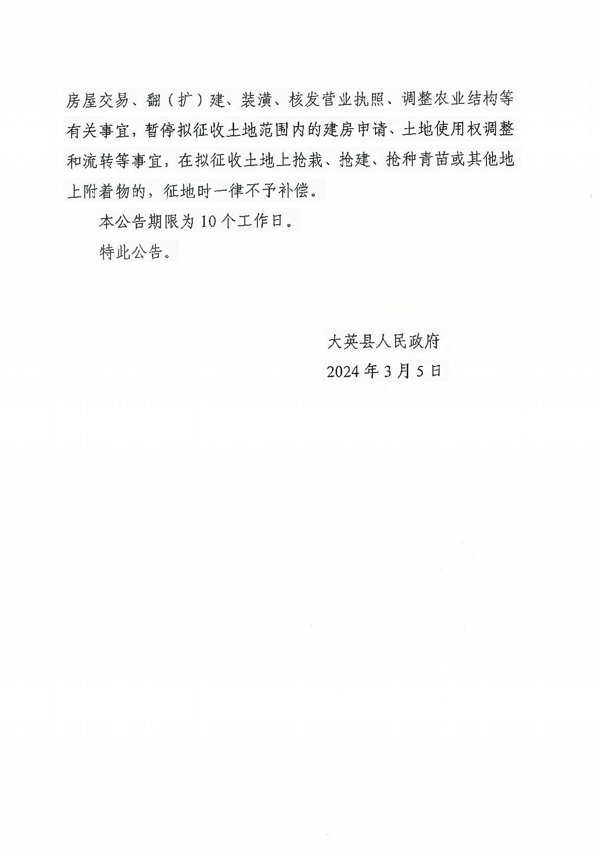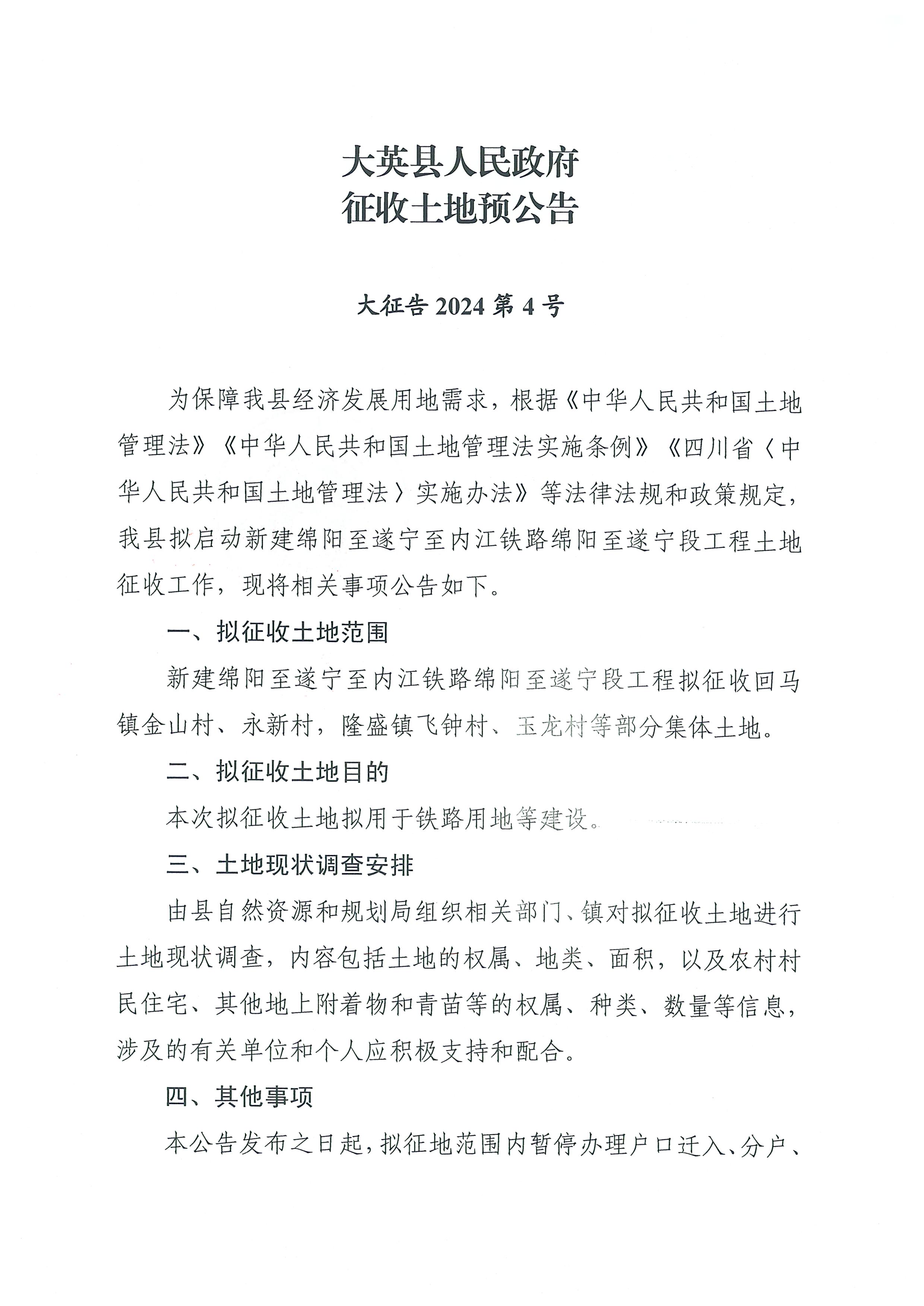 大英县人民政府征收土地预公告(大征告2024第4号)