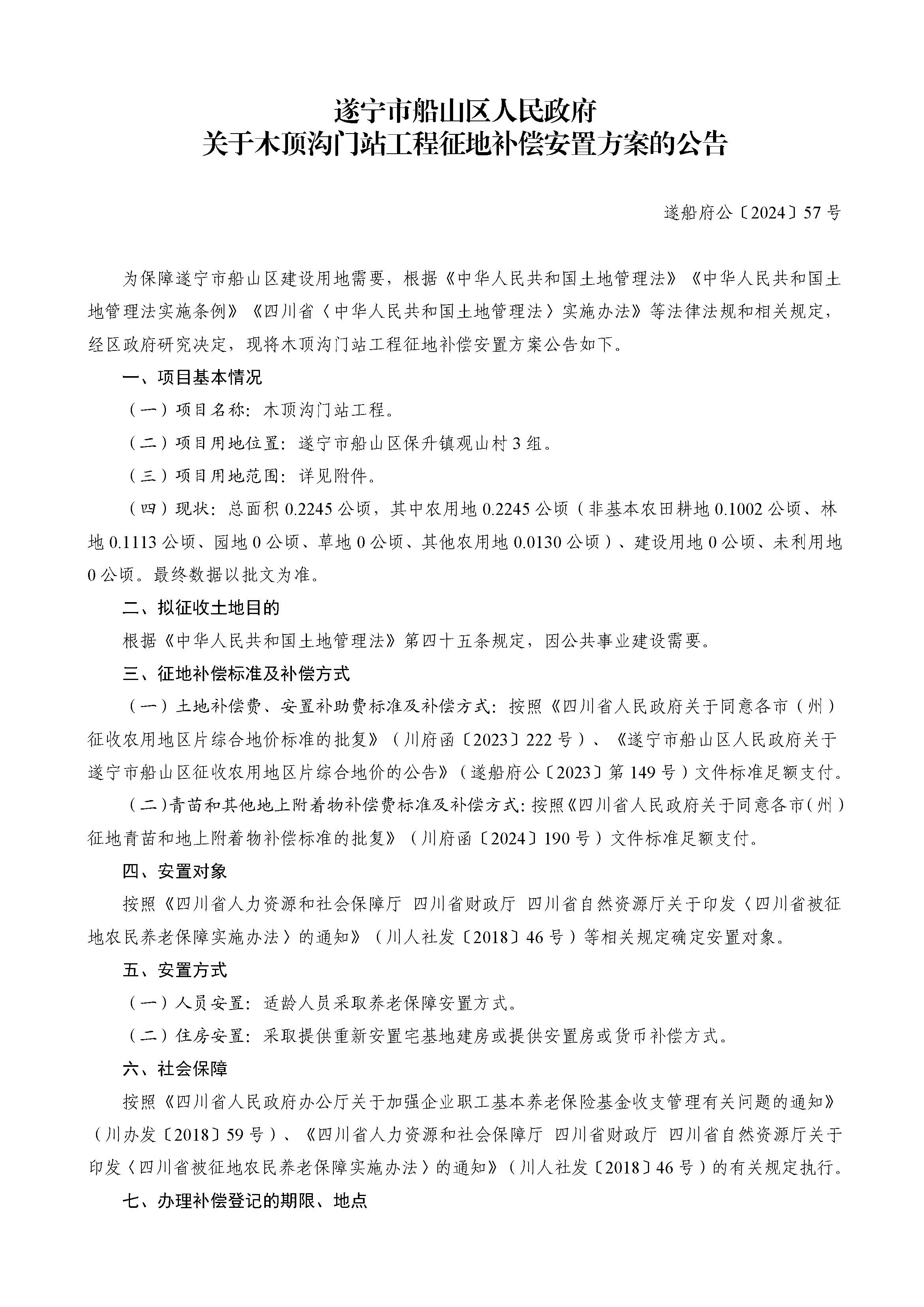 遂宁市船山区人民政府关于木顶沟门站工程征地补偿安置方案的公告(遂船府公〔2024〕57号)