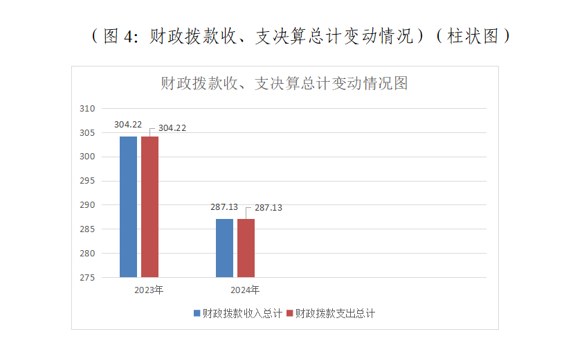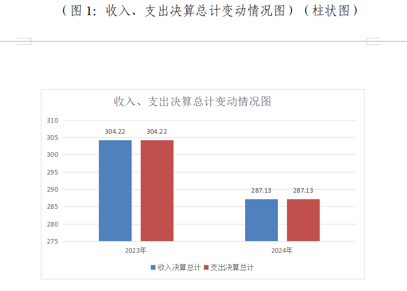 2024年度财政拨款收入、支出总计均为287.13万元。与2023年度相比,财政拨款收入总计、支出总计各减少17.09万元,下降5.62%。主要变动原因是跨区域合作及春节慰问经费减少。