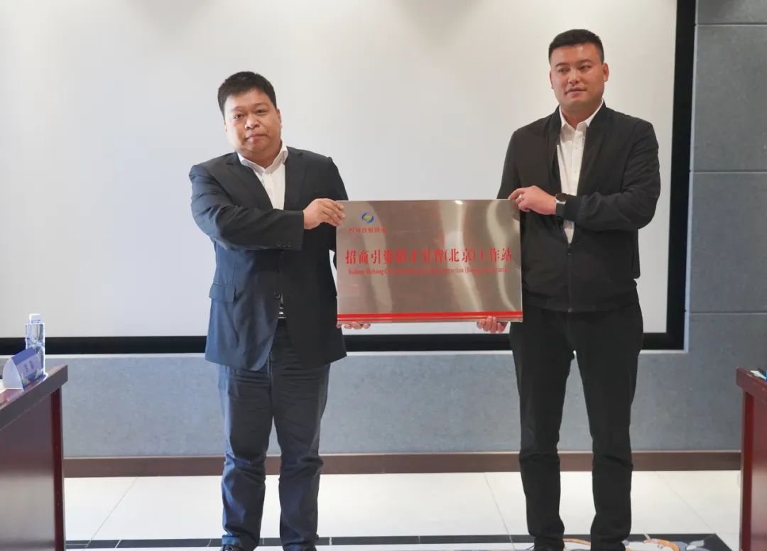 ▲射洪市委常委、组织部部长、市总工会主席甘健新为“双招双引”(北京)工作站授牌。