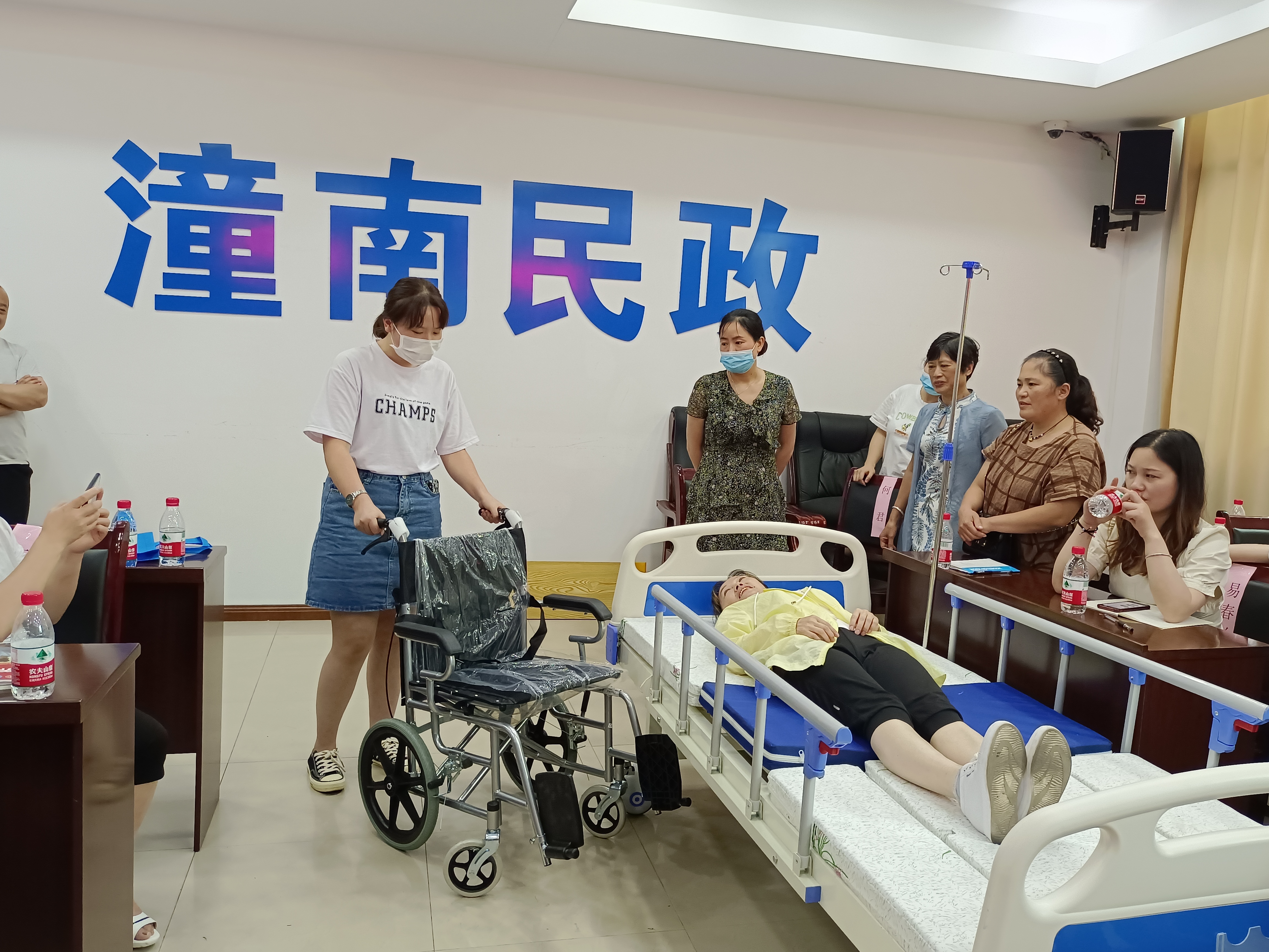 本次培训时间为6月23日到25日。潼南区民政局邀请到重庆城市管理职业学院智慧康养学院老年服务与管理专业教授、副主任医师王娟老师为大家授课。王娟老师用其扎实的养老护理学理论功底、详细的教学PPT和实操教学视频,幽默风趣、通俗易懂的为参训人员讲解了“老年人高血压病的预防及康复护理、老年人糖尿病的预防及康复护理、老年人生活照料和基础护理等理论课程,并为学员们演示了为老年人喂饭、喂药、协助老年人翻身及更换床单、协助老年人使用轮椅进行转移、为老年人湿热敷等实操教学视频。王娟老师还为大家讲解了部分地区养老护理员比赛的模拟试题,对比了近年来养老护理员比赛考核内容的变化,让学员们充分了解到养老护理员比赛考核的重点方向和主要内容,以便大家能更好地进行准备。最后,全体参训学员还分别选择了一项老年人照护项目进行现场实操。