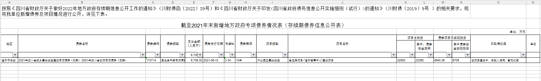按照《四川省财政厅关于做好2022年地方政府存续期信息公开工作的通知》(川财债函〔2022〕39号)和《四川省财政厅关于印发<四川省政府债务信息公开实施细则(试行)>的通知》(川财债〔2019〕9号 )的相关要求,现将我单位新增债券及项目情况进行公开,详见下表。
