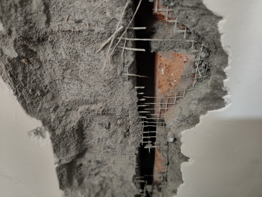 记者注意到,在这些裂缝中,最宽的裂缝宽度达2厘米以上,可以见到墙体内的砖头、混凝土,甚至可以看出墙体的砖头和混凝土之间存在较大空隙,而部分裂缝也正顺着这样的空隙不断蔓延。