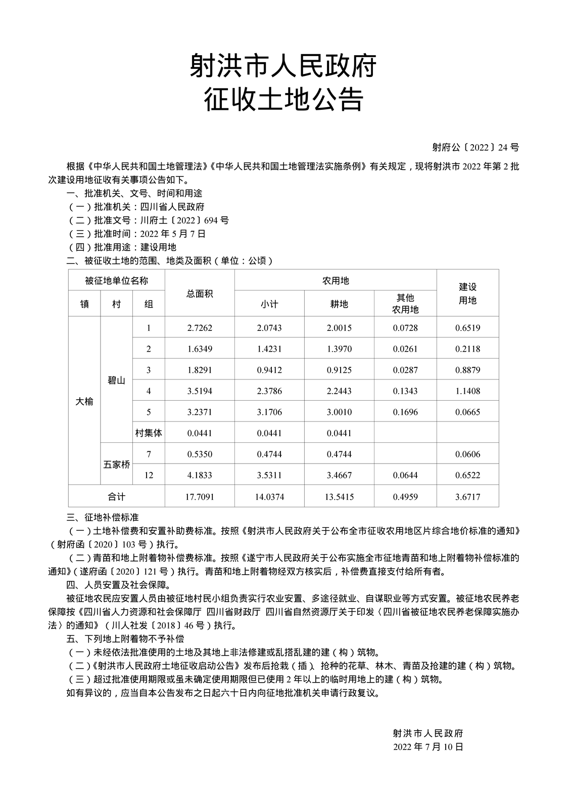 射洪市人民政府征收土地公告(射府公〔2022〕24号)2022年第2批次