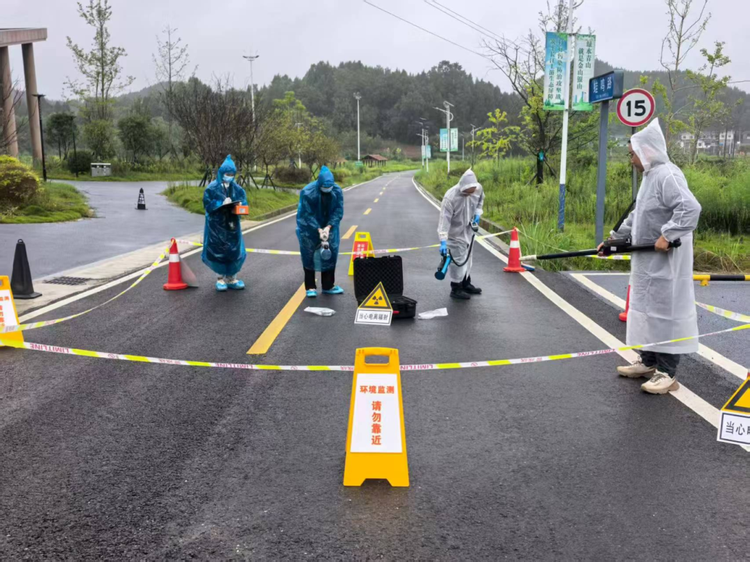 此次演练模拟当日早上8:00,一辆运载1吨轻质汽油的农机车和一放射源运输车辆因雨天路滑在318国道里坝镇发生碰撞,造成两车侧翻,放射源散落引发辐射安全事故,汽油贮存罐撞击后破裂,导致约0.5吨轻质汽油泄漏至赤溪,可能造成赤溪南充-遂宁跨界污染事故,可能对下游水质造成威胁。