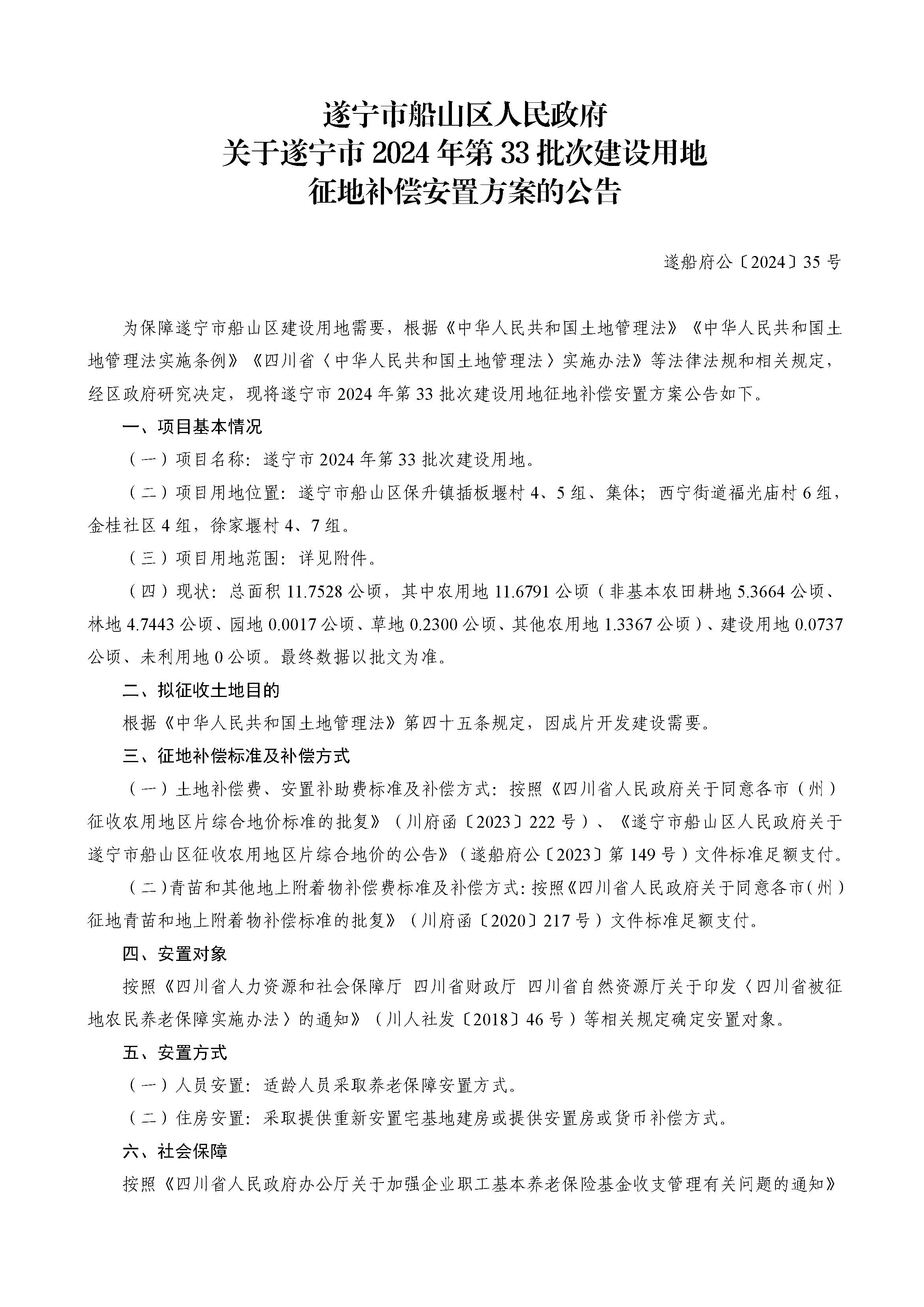 遂宁市船山区人民政府关于遂宁市2024年第33批次建设用地征地补偿安置方案的公告 (遂船府公〔2024〕35号)
