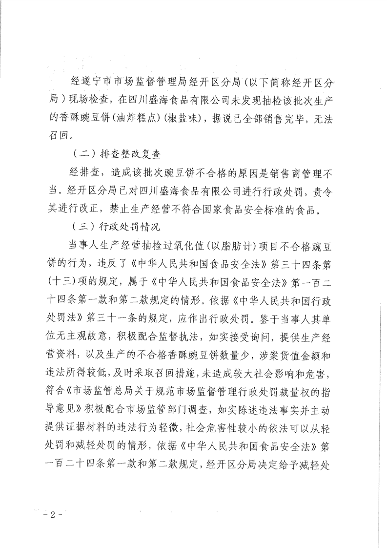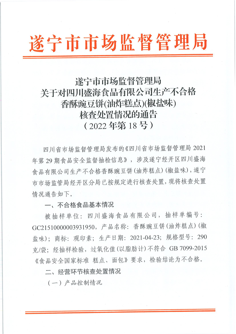 关于对四川盛海食品有限公司生产不合格香酥豌豆饼(油炸糕点)(椒盐味)核查处置通告