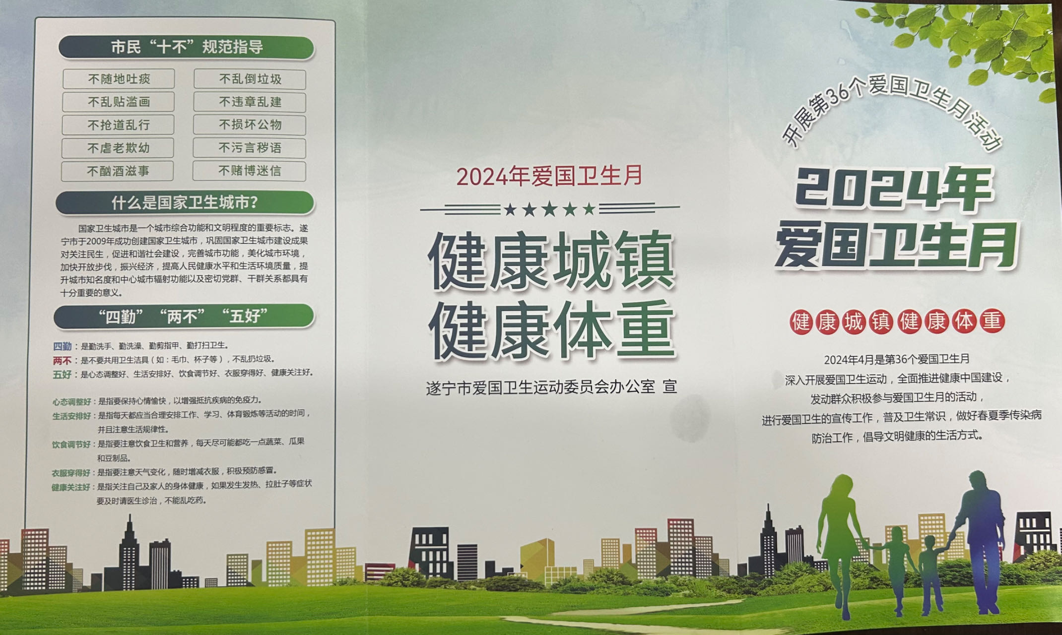 为确保爱国卫生月活动抓出实效,遂宁市爱卫办印发了《关于转发<全国爱卫办关于开展第36个爱国卫生月活动的通知>的通知》文件,各县市区、市直园区制定活动方案,积极开展爱国卫生月活动,引导群众积极参与。截至目前,市爱卫办通过东旭阳光酒店幕墙大屏滚动宣传爱卫生月宣传标语480条,发放宣传折页3000份。