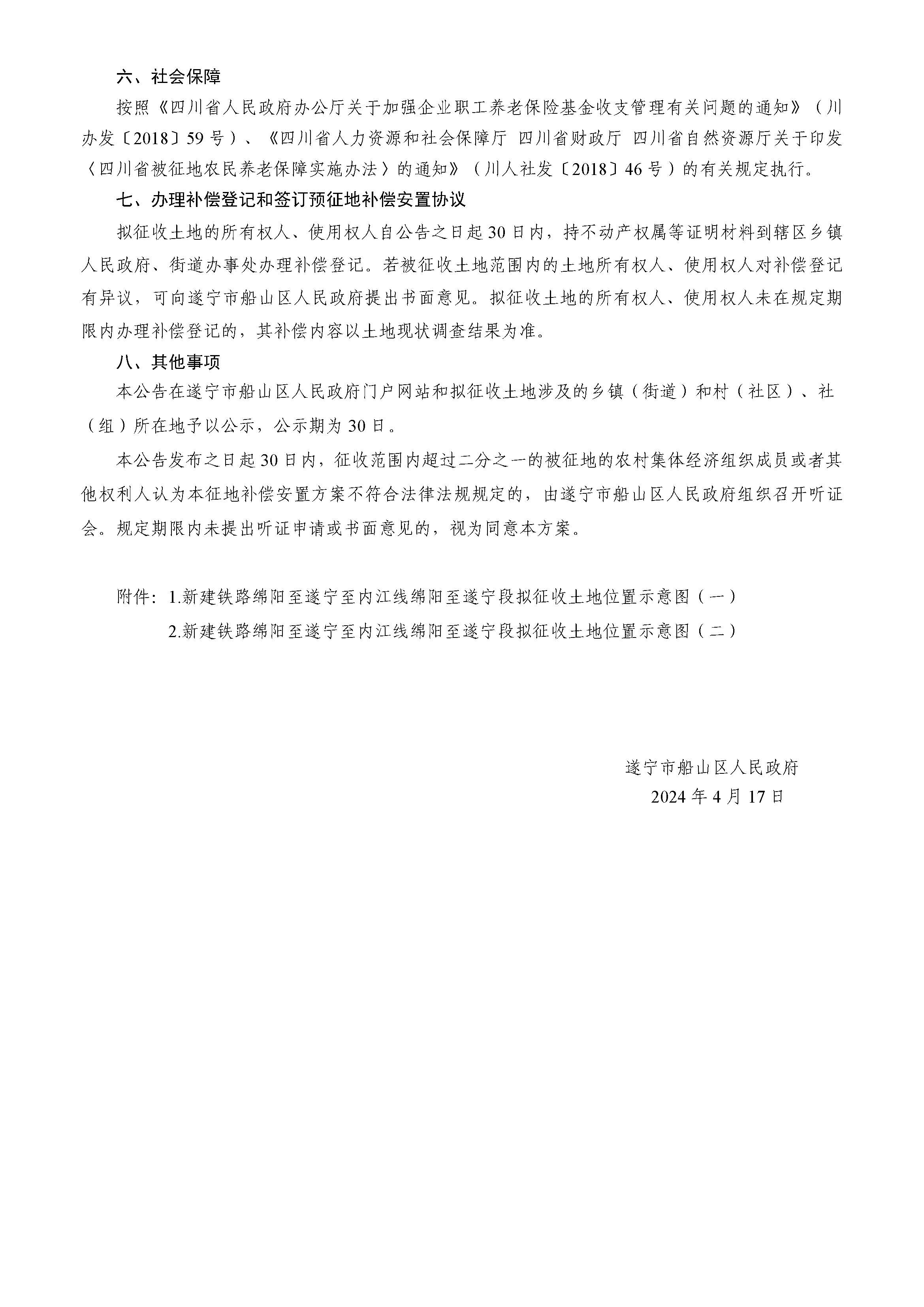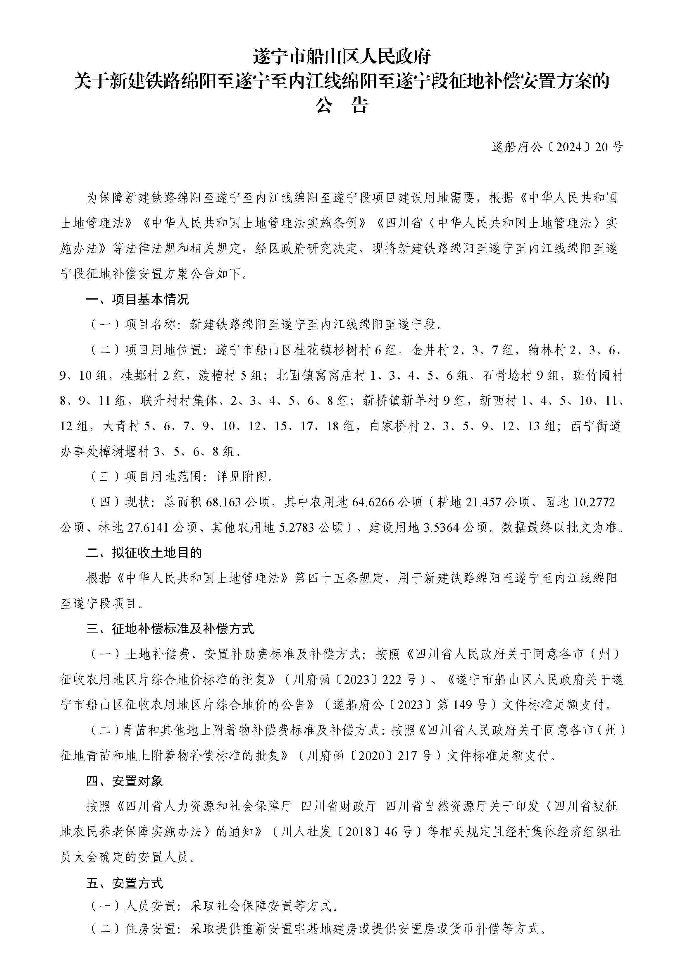 遂宁市船山区人民政府关于新建铁路绵阳至遂宁至内江线绵阳至遂宁段征地补偿安置方案的公告(遂船府公〔2024〕20号)