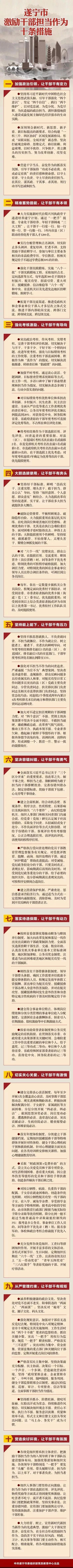 《十条措施》以有效调动全市广大干部干事创业活力为主线,从加强政治引领、精准蓄势提能、强化考核激励、大胆选拔使用、坚决容错纠错、落实待遇保障、切实关心关爱、从严约束管理、营造良好环境方面提出了具体措施,让干部既有定力、有导向、有规矩,有本领、有奔头,又有压力、有勇气、有动力、有激情。其中,在考核激励方面,提出要改进年度考核、加强平时考核、加强考核结果运用,切实解决干与不干、干多干少、干好干坏一个样的问题。在选拔使用方面,鲜明选拔导向,破除论资排辈、平衡照顾观念,破除隐形台阶,大力选拔使用优秀干部,让干部有多大担当就提供多大舞台。