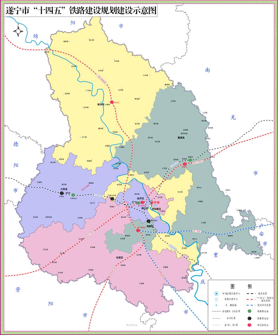 ——铁路。建设运营铁路3条、319.5公里,其中高铁里程76.5公里,建成和在建铁路覆盖全部县(市、区)[3] ,出遂铁路通道数量达到7个(新增4个)。