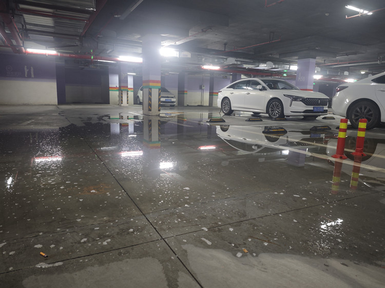 “下雨的时候,到处都在渗水、漏水,整个地面积水最深的地方超过10厘米。”刘先生介绍,几乎只要地面出现了裂纹的地方,都成为了渗水点,同时车库顶部也在不断漏水。这种情况下,前期采取的开挖引水槽等措施无法大面积实施,积水问题难以解决。
