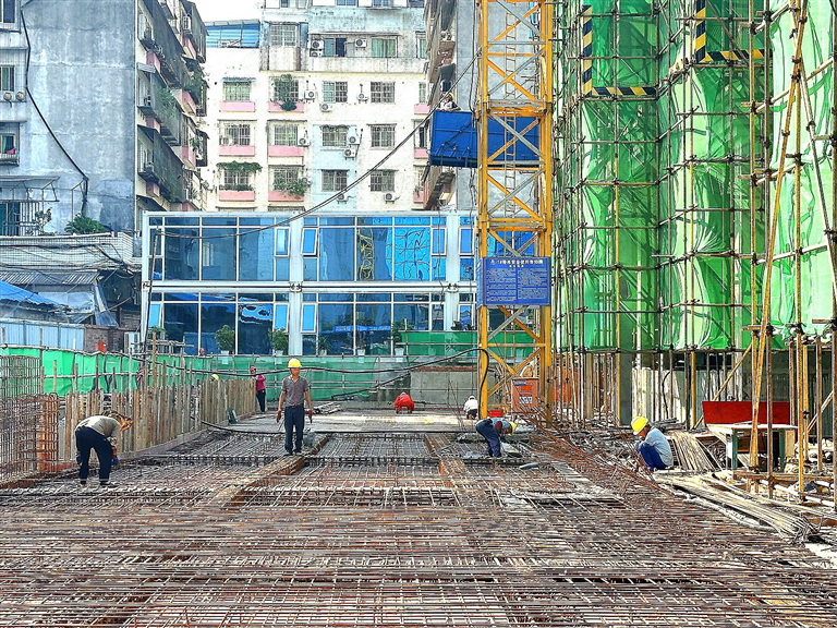 在船山区南片区城市有机更新项目(开善片区)现场,烈日热浪中,建筑工人们仍开足马力、抢抓进度,不断刷新项目建设“进度条”。
