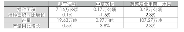 初步统计,2018年,遂宁油料、中草药材、蔬菜及食用菌、水果播种面积分别为7.16、0.17、3.49万公顷,同比分别增长0.1%、-1.5%、2.3%,产量分别为19.63万吨、0.97万吨,107.27万吨,同比分别增长0.5%、3.8%、2.3%。水果产量达到9.38万吨,同比增长11.6%。