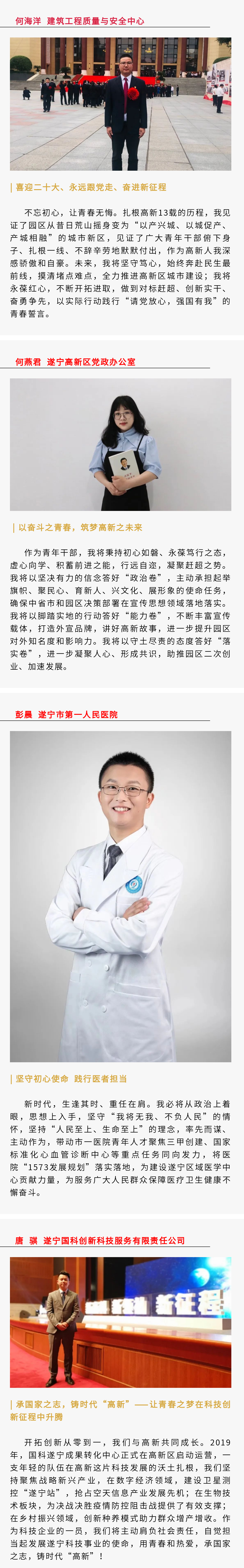 青年有力量,国家有希望。在喜庆中国共产主义青年团成立100周年之际,遂宁高新区广大团员青年干部始终坚守初心,矢志不渝跟党走;始终牢记使命,为党和人民不懈奋斗,唱响奋斗高新、建设高新“最强音”!