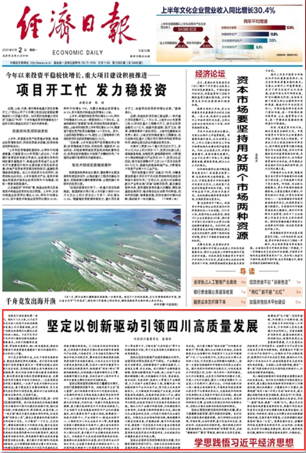 《经济日报》8月2日在“学思践悟习近平经济思想”专栏中,发表了中共四川省委书记彭清华的署名文章《坚定以创新驱动引领四川高质量发展》,予以转载。