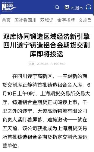 在四川遂宁高新区,一座崭新的期货交割库正静待首批铸造铝合金入库。6月10日上午9时,上海期货交易所交易大厅,铸造铝合金期货正式鸣锣上市。千里之外的遂宁,天诚高新物流有限公司负责人紧盯着屏幕,难掩激动——就在五天前,该公司获批成为上海期货交易所首批铸造铝合金期货指定交割仓库运营单位。