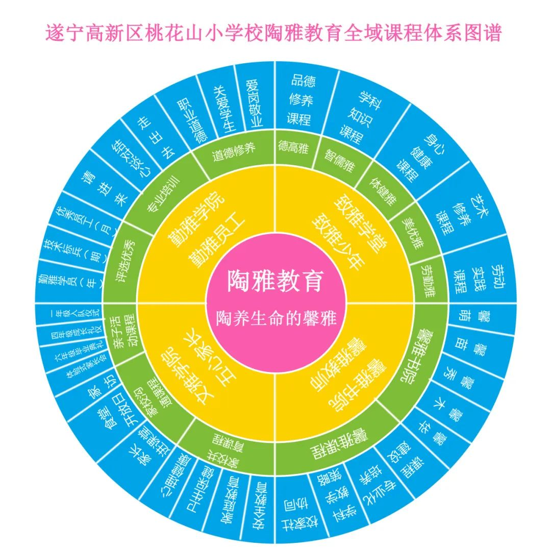 桃花山小学校陶雅教育全域课程体系由校长、课程专家、教师、学生家长等共同参与的,构建开发陶雅课程的组织网络,形成领导小组——教研组——教师——学生的开发网络,通力合作,共同创建“学习型校园”。包括学生-致雅课程、教师-馨雅课程、家长-文雅课程、员工-勤雅课程。