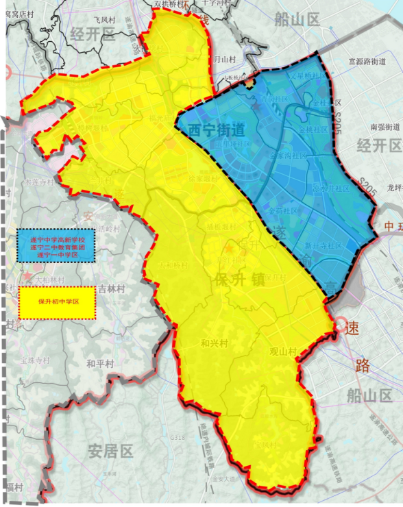 (一)遂宁中学高新学校、遂宁二中教育集团、遂宁一中学区范围:东至205省道;南至新源大道(保升镇边界);西至遂渝高速;北至西宁大道(具体以《遂宁高新区2023年初中学区划分图》为准)。