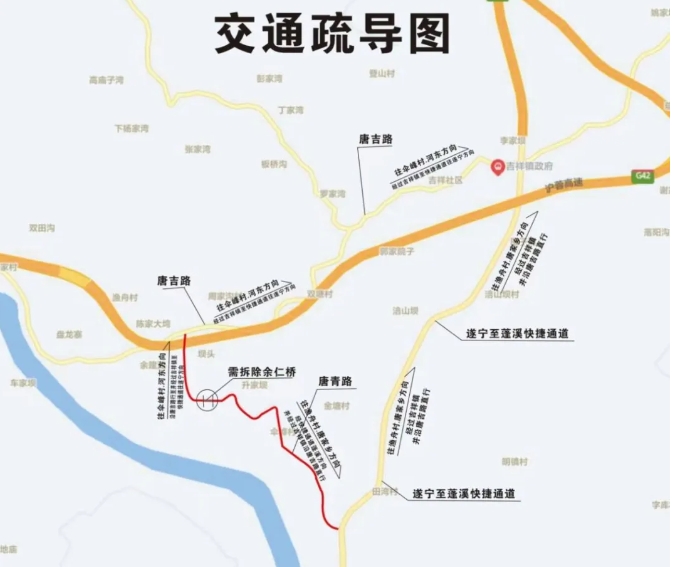 往返唐家乡及周边地区的居民,可以从遂蓬快捷通道途经吉祥镇,往返唐家乡。