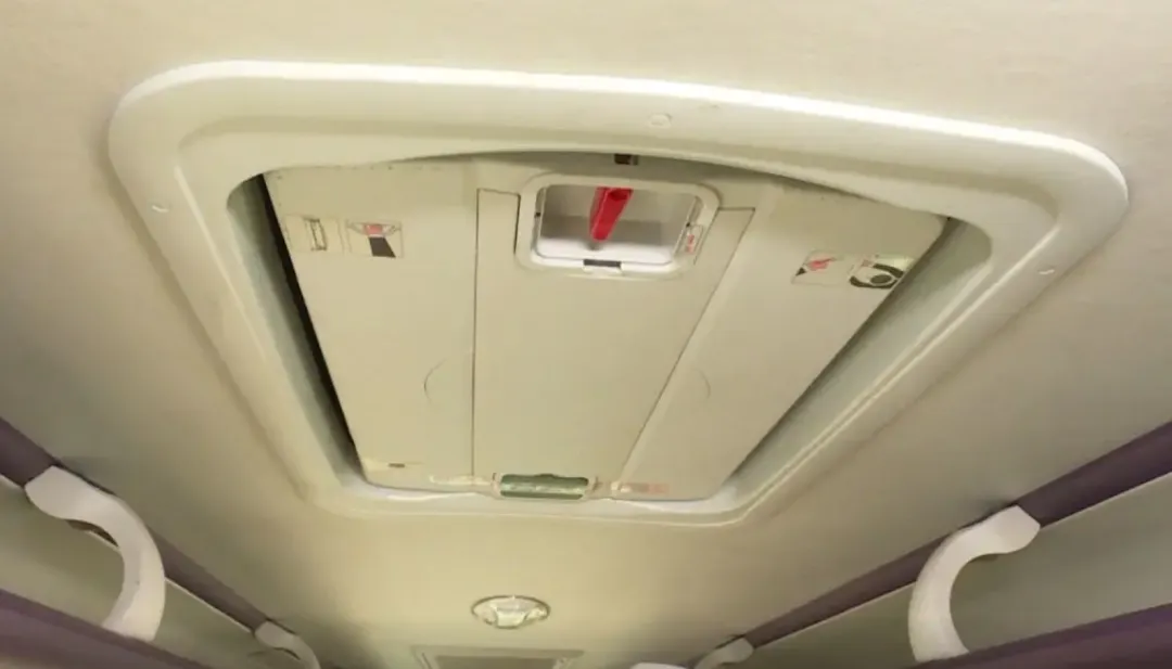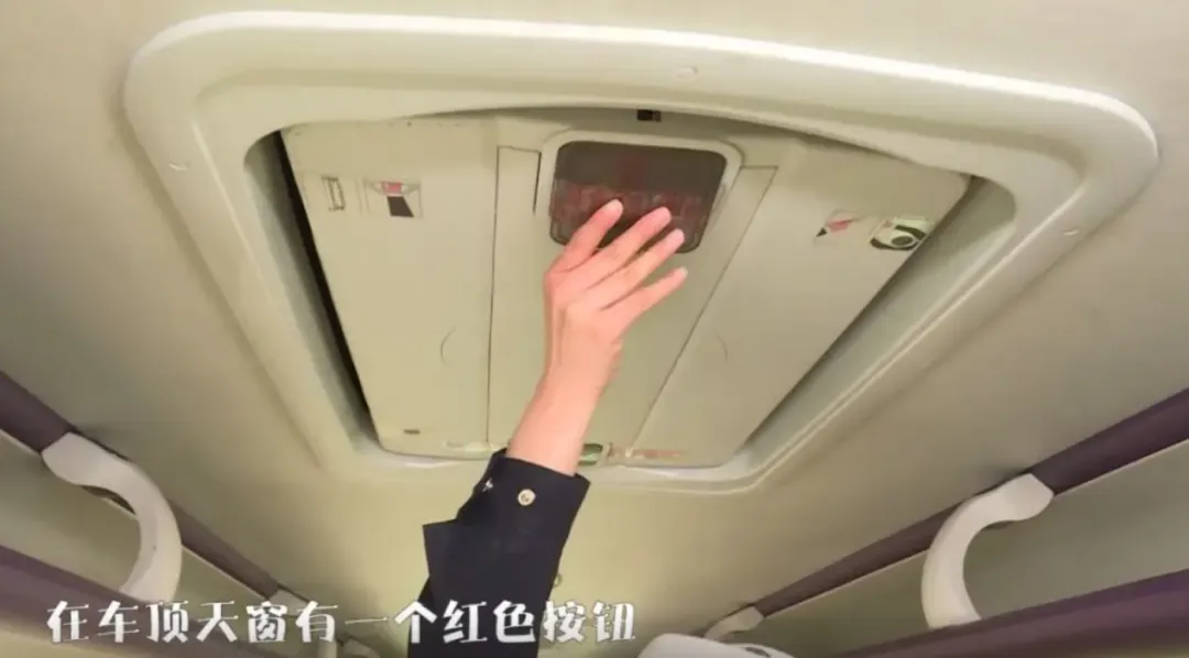 车顶天窗上有一个红色开关,扭动之后,用力向上推,即可打开天窗逃生。