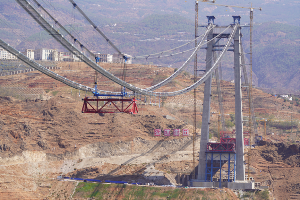 ● 历经约4小时精密作业,蜀道集团投建的沿江高速川滇金沙江特大桥跨中首段吊装成功,标志着大桥施工正式进入钢桁梁吊装阶段。该桥地处高地震烈度区(Ⅷ度0.3g),为我国千米级悬索桥地震烈度最高者,主桥为1060米单跨双塔钢桁梁悬索桥。