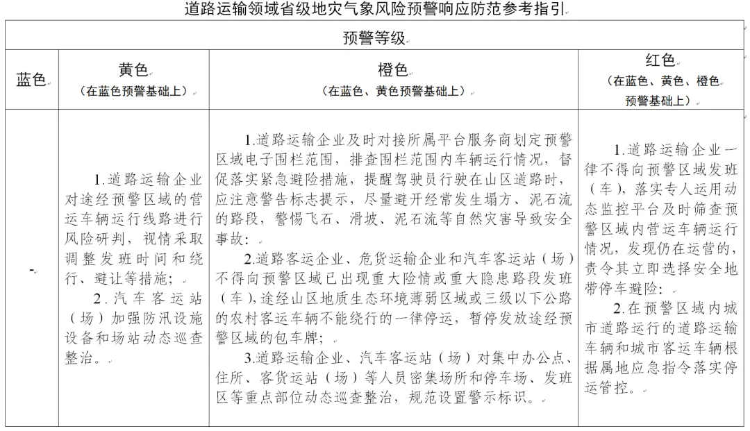 黄色预警,在蓝色预警响应措施基础上,督促运输企业开展对途经预警区域的营运车辆运行线路风险研判,视情采取调整发班时间和绕行、避让等措施。客运班车临时改道时间在7日以内的,由客运企业自行调整,并在3个工作日内报交通运输部门备案。