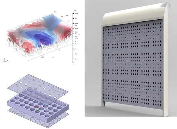该材料基于声学超结构技术研发,结合多单元共振耦合技术和多孔材料及特殊构造孔,可实现在交通领域全频带吸声降噪,尤其对频率在100~500Hz的中低频段噪声有针对性的大带宽吸声效果,中低频段吸声系数≥0.8,高频段吸声系数≥0.7,降噪系数≥0.75,隔声量≥46dB。质轻、可塑性强、A1级防火,特别适用于解决公路和城市道路交通噪声问题。
