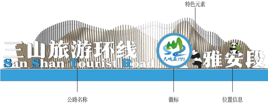 (5)公路形象标识:采用景墙、雕塑、小品、牌坊等形式突显公路身份、美化路域景观、宣传地域形象的标识。