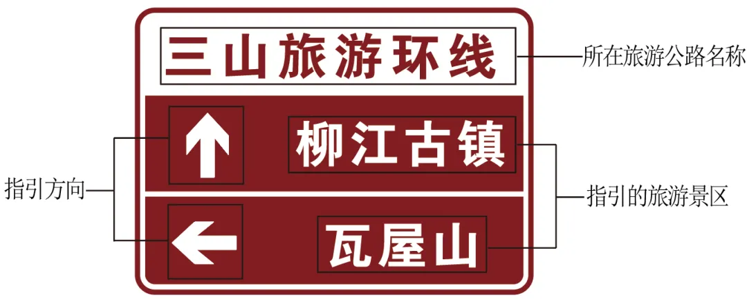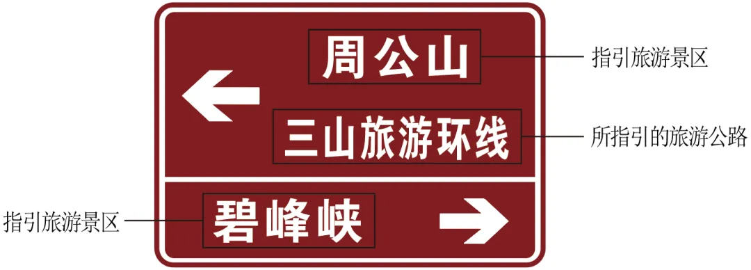 (1)旅游指引标志:用以提供旅游景区、旅游公路的名称、方向、距离等信息。根据指引对象分为旅游景区指引标志和旅游公路指引标志。