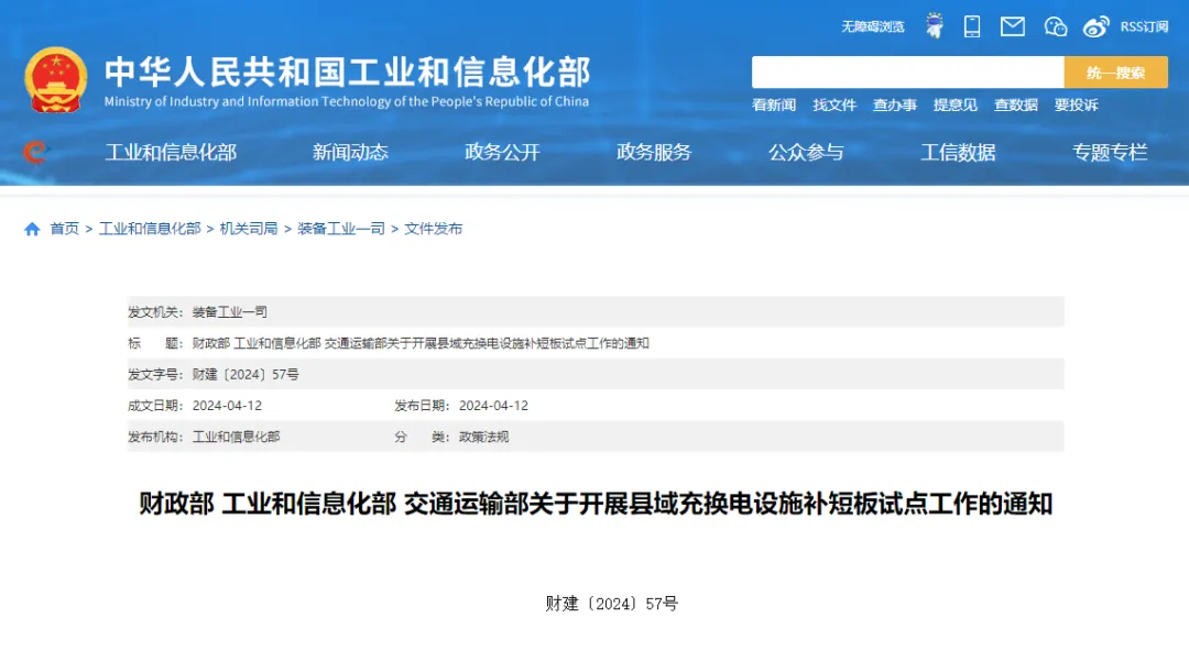 4月12日,财政部、 工信部、交通运输部发布《关于开展县域充换电设施补短板试点工作的通知》。文件提出将开展“百县千站万桩”试点工程,加强重点村镇新能源汽车充换电设施规划建设。中央财政将安排奖励资金支持试点县开展试点工作。试点县新建充换电基础设施应面向全社会开放、可用率不低于99%、额定功率120千瓦以上(含120千瓦),大力推广智能快充公共充换电基础设施。