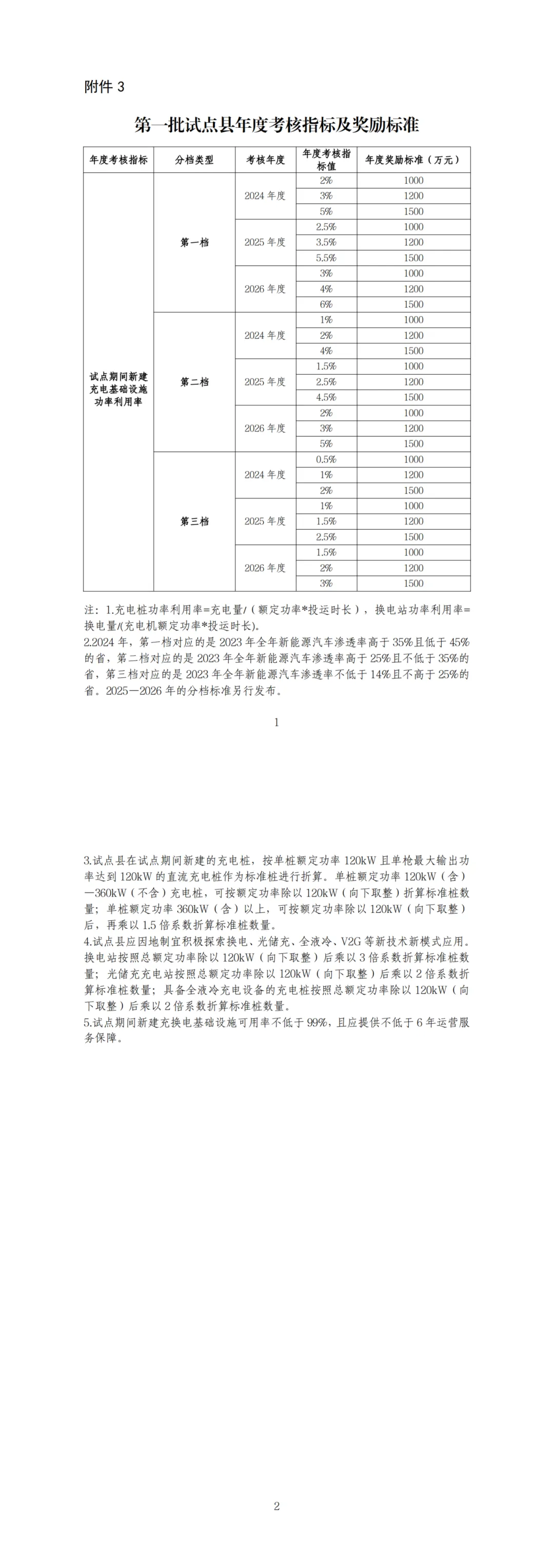 中央财政对经三部门同意备案且完成任务目标的试点县给予奖励资金支持,每个试点县示范期为3年。奖励标准根据每年度试点县充换电设施功率利用率达标情况设置,共分为三个档次。示范期内,每年均达到最高目标的试点县最多可获得4500万元(具体年度考核指标及奖励标准见附件3)。