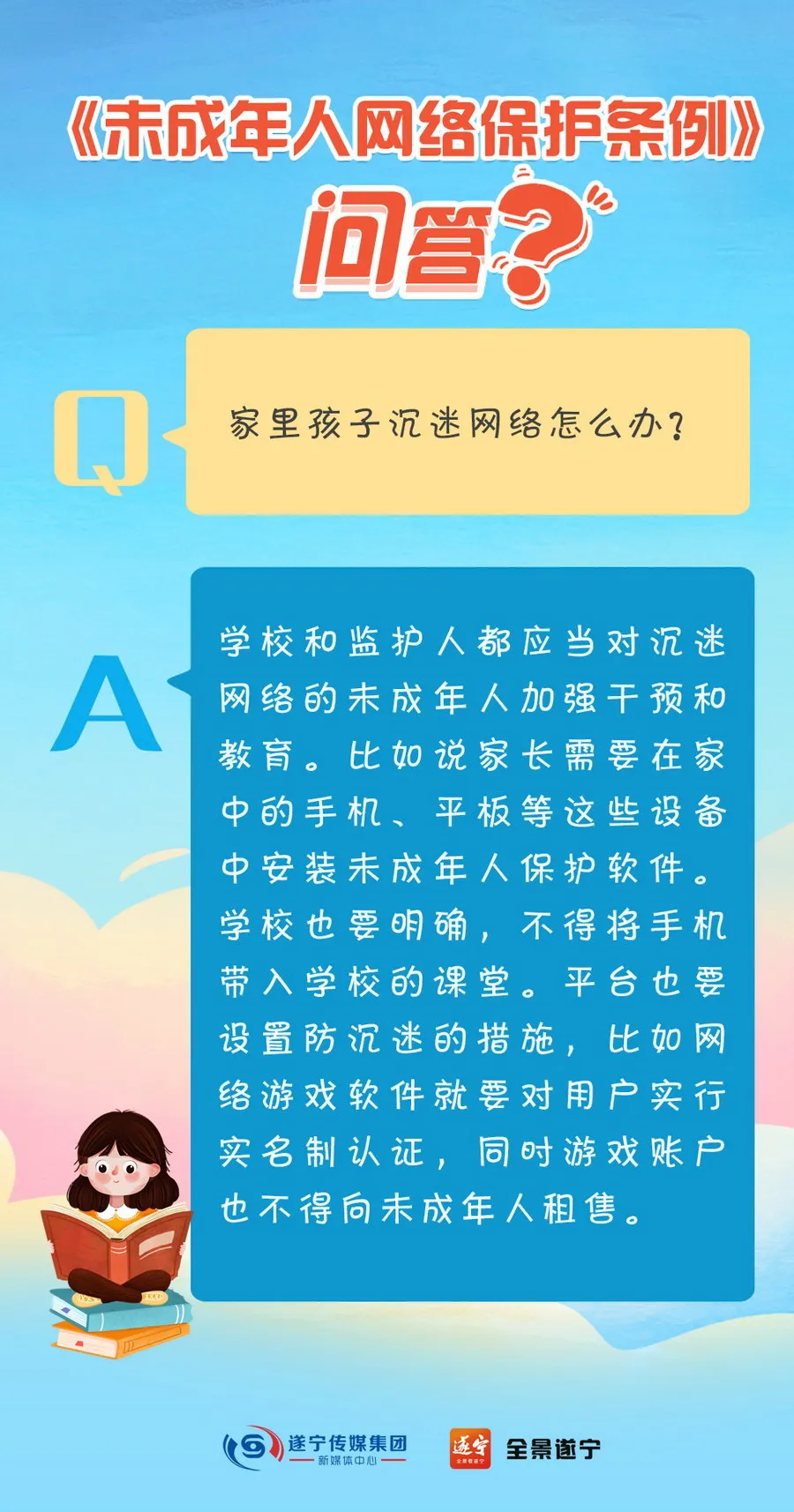 2024年1月1日起《未成年人网络保护条例》(以下简称《条例》)正式施行《条例》共7章60条重点对促进网络素养、规范网络信息内容、保护个人信息、防治网络沉迷等方面作出规定一组问答海报带你学习《条例》重点↓↓来源:全景遂宁