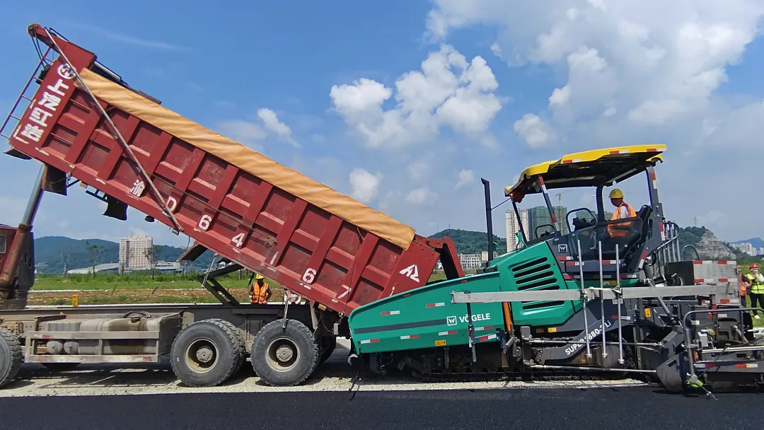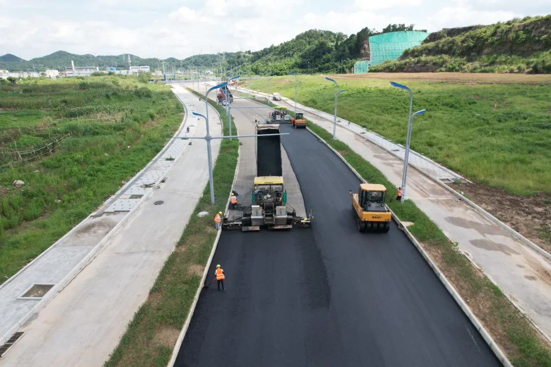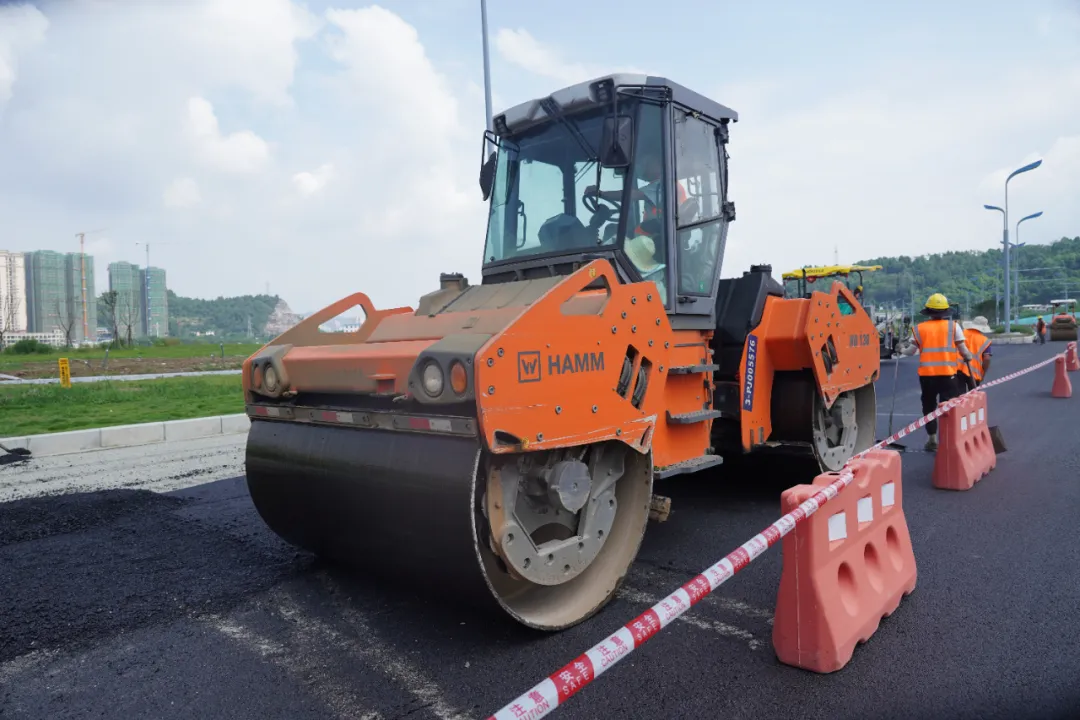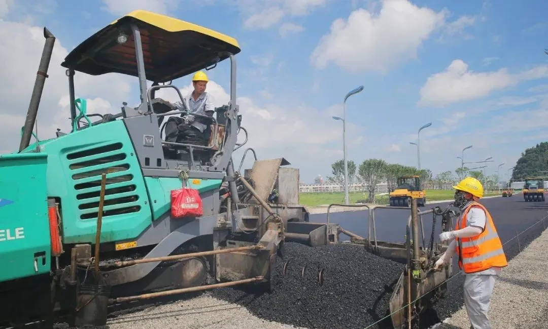 施工现场,一辆辆压路机正平稳运行,工人师傅们在沥青铺路机前紧张忙碌着,忙碌的身影与机器的轰鸣声交织成一幅生动的建设画卷。