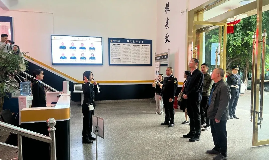 工作组一行现场观看了执法车辆的展示和执法队伍准军事化队列现场演示;查看了市交通综合行政执法支队办公大楼外观标识、执法服务大厅、装备室、备勤室等功能性基础设施规范化建设情况,以及人员公示栏、廉政文化墙设置等内容;听取了工作汇报,并查阅“四基四化”建设开展情况相关资料。