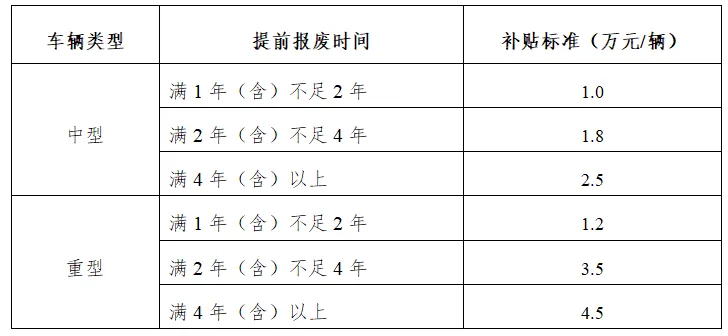 答:本次货车补贴实施范围主要有3类,分别是仅提前报废、报废并更新、仅新购车辆,补贴标准如下: