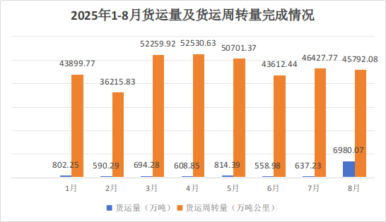 (一)货运量完成情况。2025年1—8月货运量5346.316万吨,同比增长68.64%;