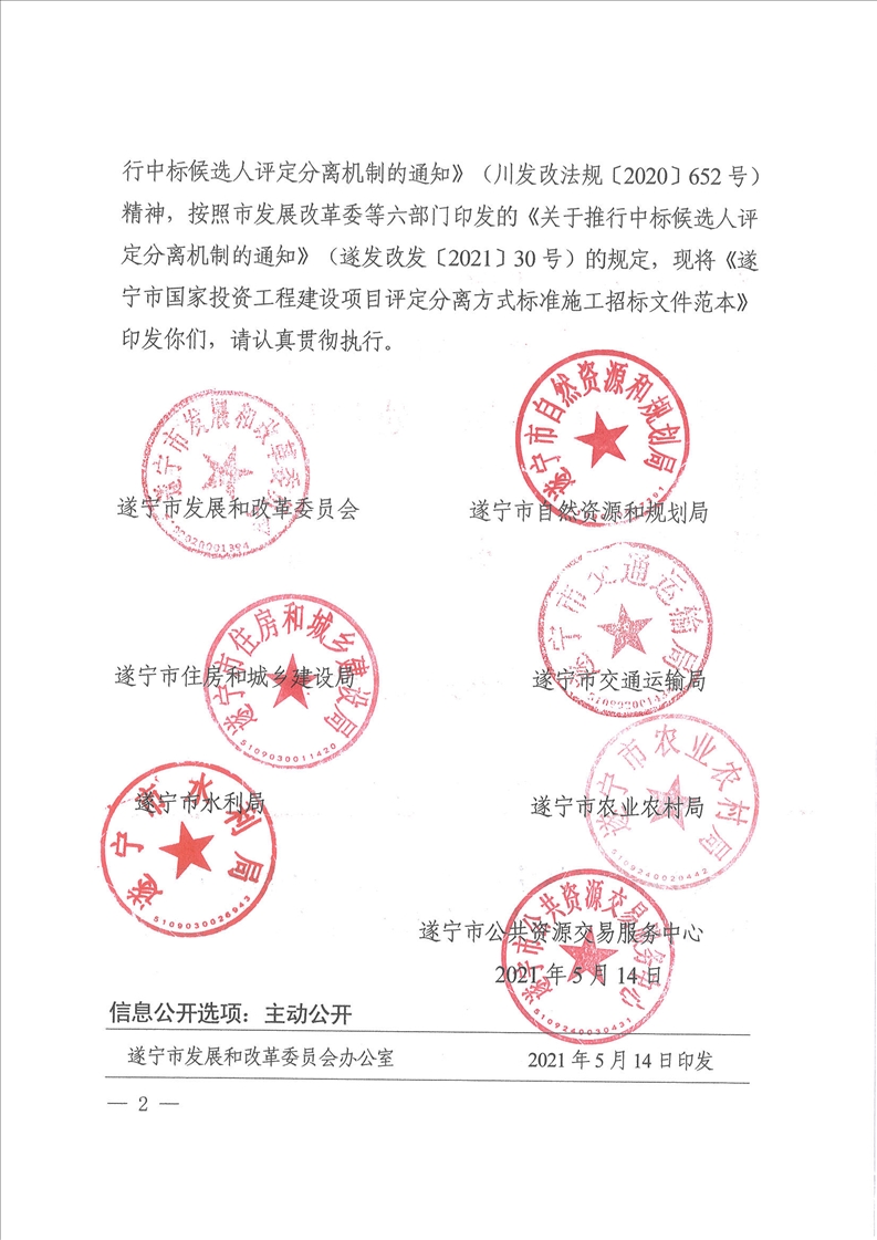 遂宁市发展和改革委员会等7部门关于印发《遂宁市国家投资工程建设项目评定分离方式标准施工招标文件范本》的通知(遂发改发〔2021〕79号)