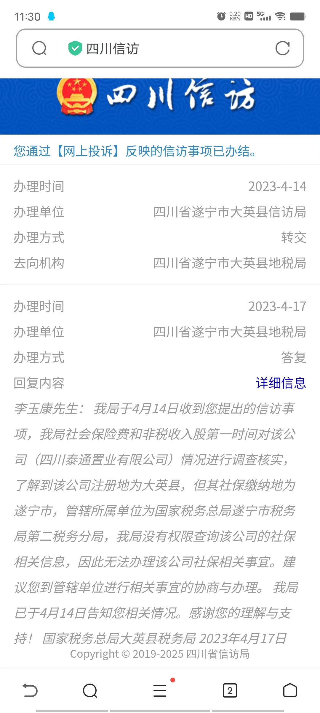 通过12345投诉遂宁市河东第二分局回复不是下属单位没办法监管,通过大英信访局上访,大英县税务局回复社保在遂宁市市社保局购买也无法处理(见附件),2022年7月离职到现在通过了各种途径催促公司缴纳相关费用,泰通公司上属永逸集团公司一直回复企业困难无法支付,待经营好转后再支付,从2019年7月拖欠社保费,集团公司财务缴费也很奇怪之前欠的不交,交后面的月份,2021年的缴费记录可以看到(见附件)。作为员工我们个人部分公司已经扣除,一直没有缴费,我们求助的部门都没有。希望相关部门协助负责催促。
