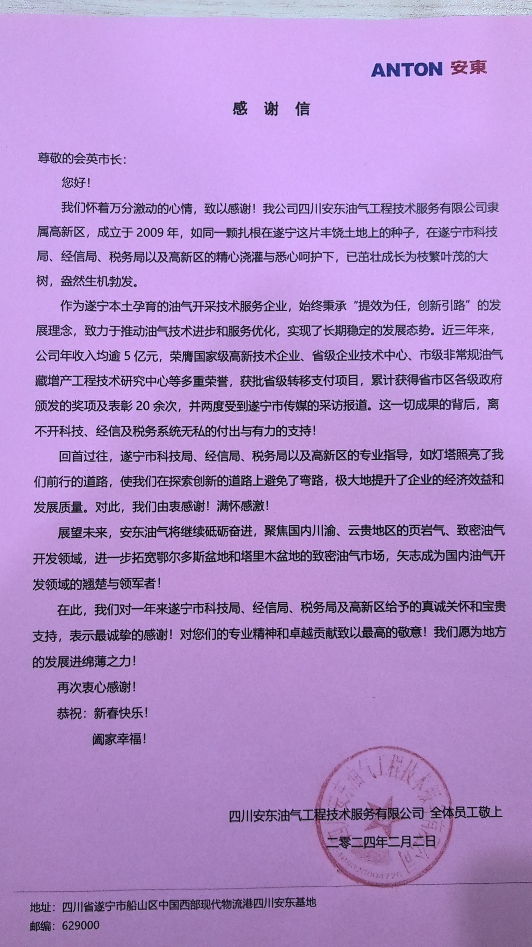 我们怀着万分激动的心情,致以感谢!我公司四川安东油气工程技术服务有限公司隶属高新区,成立于2009年,如同一颗扎根在遂宁这片丰饶土地上的种子,在遂宁市科技局、经信局、税务局以及高新区的精心浇灌与悉心呵护下,已茁壮成长为枝繁叶茂的大树,盎然生机勃发。