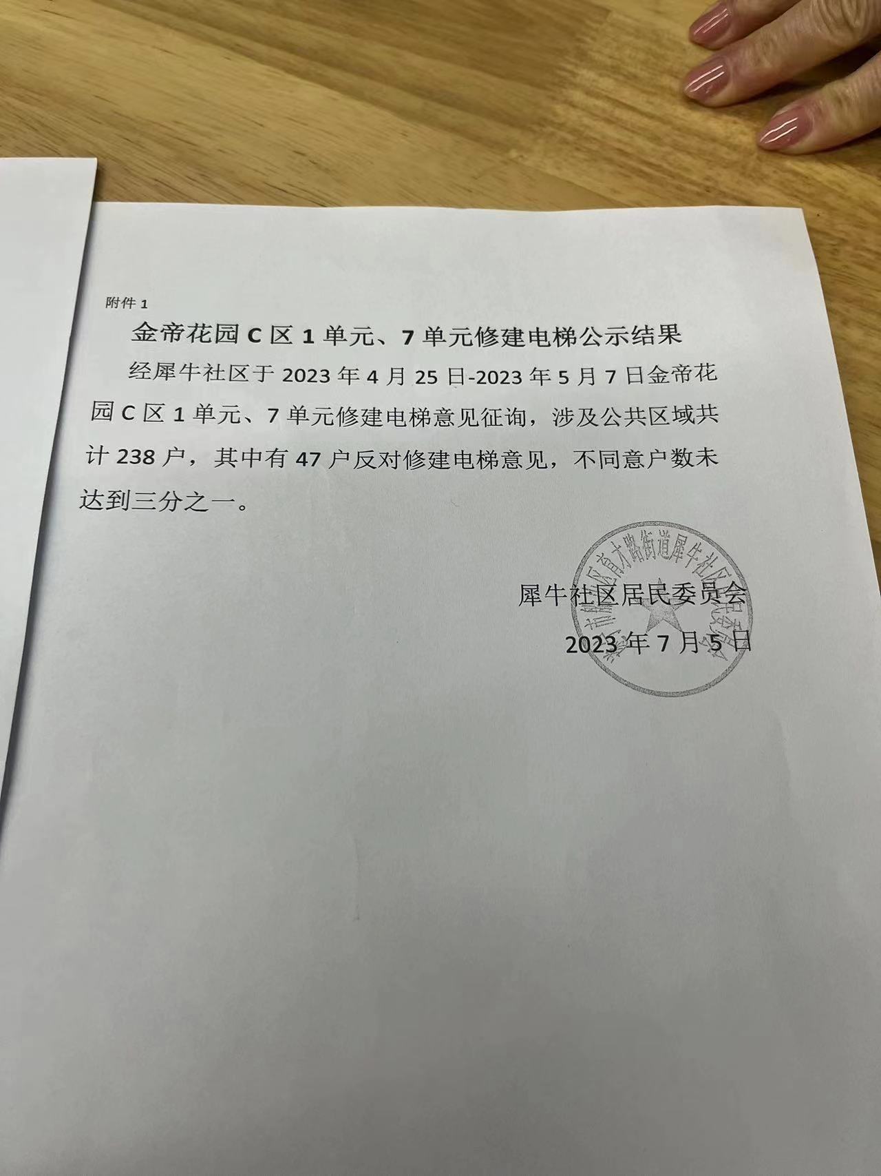 金帝花园C区1单元、7单元修建电梯公示结果经犀牛社区于2023年4月25日-2023年5月7日金帝花网C区1单元、7单元修建电梯意见征询,涉及公共区域共计238户,其中有47户反对修建电梯意见,不同意户数未达到三分之一。