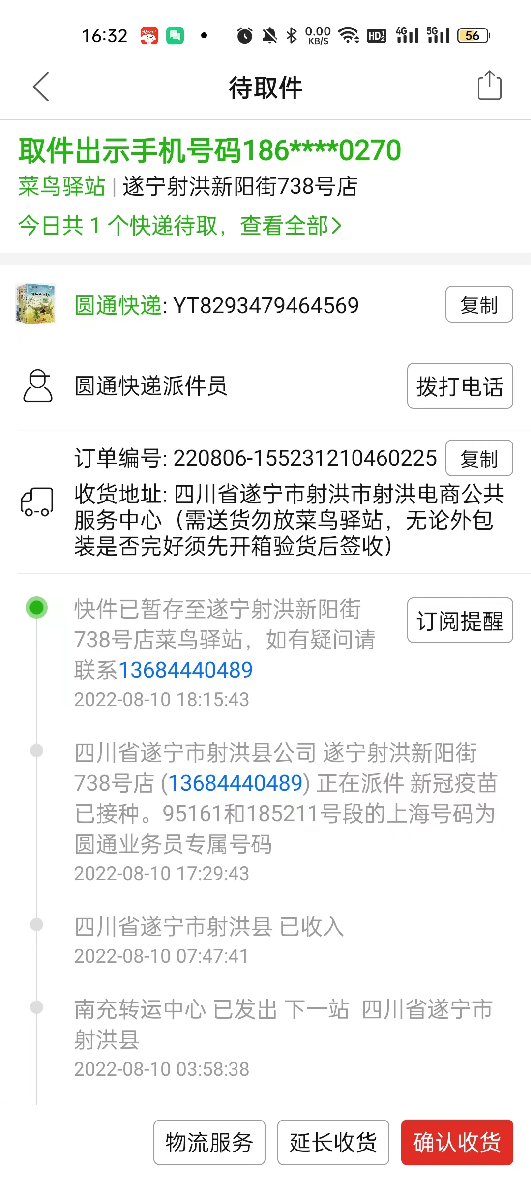 圆通快递单 号YT8293479464569,10号就到了射洪结果至今5天未派送,也没接到电话通知。请邮政管理部门协助处理。在收件地址上已明确注明,该件需送货请勿放菜鸟驿站。且本人还专门打过菜鸟驿站总部公司电话,把我的号码标识为需要派送的客户。快递公司未联系直接放菜鸟,菜鸟至今5天了即未派送,也没电话通知。严重侵犯了本人权益,造成了重大损失。