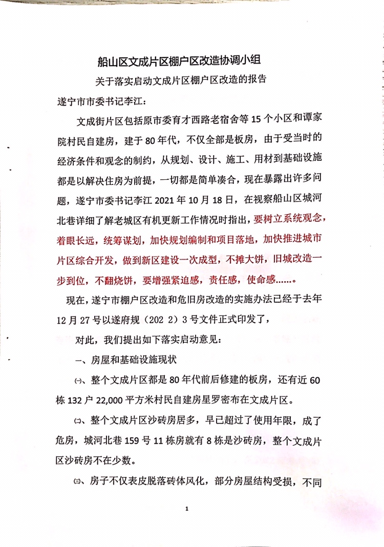 船山区文城片区棚户区改造协调小组关于落实启动文成片区棚户区改造的报告