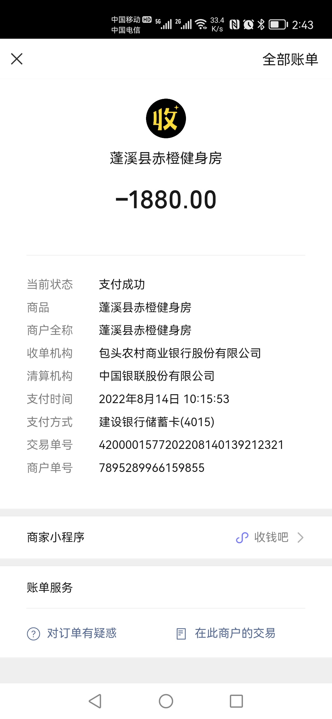 2022年8月14日,我通过微信向蓬溪县赤橙游泳健身房(收款单位)支付人民币1880元(另有200元定金在外)办理2年亲子卡游泳健身套餐,根据协议可在该店分店遂宁喜益门店参与游泳培训和健身活动,但蓬溪县赤橙游泳健身房分店喜益门店至今不具备正式营业条件(泳池无水、无游泳安全员、水温未达到恒温、健身房无专业教练、消防验收不合格、提供服务与合同约定天差地别),且蓬溪县赤橙游泳健身房至今未向我开局正式税务发票(疑似偷漏税),历经数月苦等其分店整改达到营业标准,但该分店至今未有任何整改迹象。目前总店和分店相互扯皮,拒不承担责任。我认为,谁收钱,谁办事,天经地义,既然蓬溪县赤橙游泳健身房不能为我提供约定的服务,或者说总店与分店毫无关联,那好,我的钱是交到总店账户上的,既然总店与分店无关系,请总店将收取我的1880元退还给我,总店不可能白白收取我的1880元钱啥,天下怕没有这种道理哦。