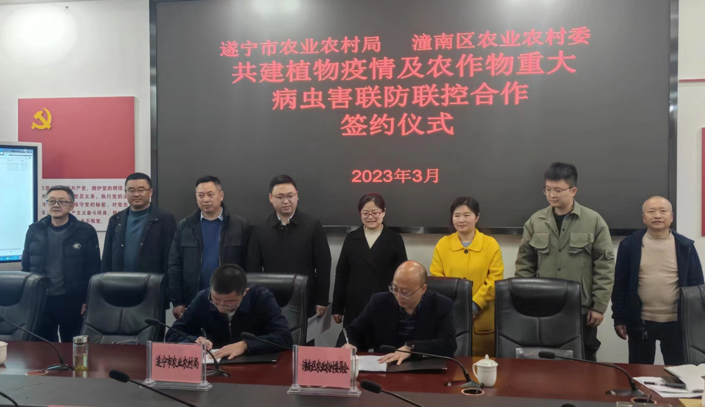 2023年3月24日,遂宁市农业农村局与重庆市潼南区农业农村委成功签订共建农业植物疫情及农作物重大病虫害联防联控合作协议,共同构筑川渝植物疫情及农作物重大病虫害安全防线。遂宁市农业农村局副局长梁军、总农艺师杨桓,重庆市潼南区农业科技推广中心副主任张璞出席签约仪式。