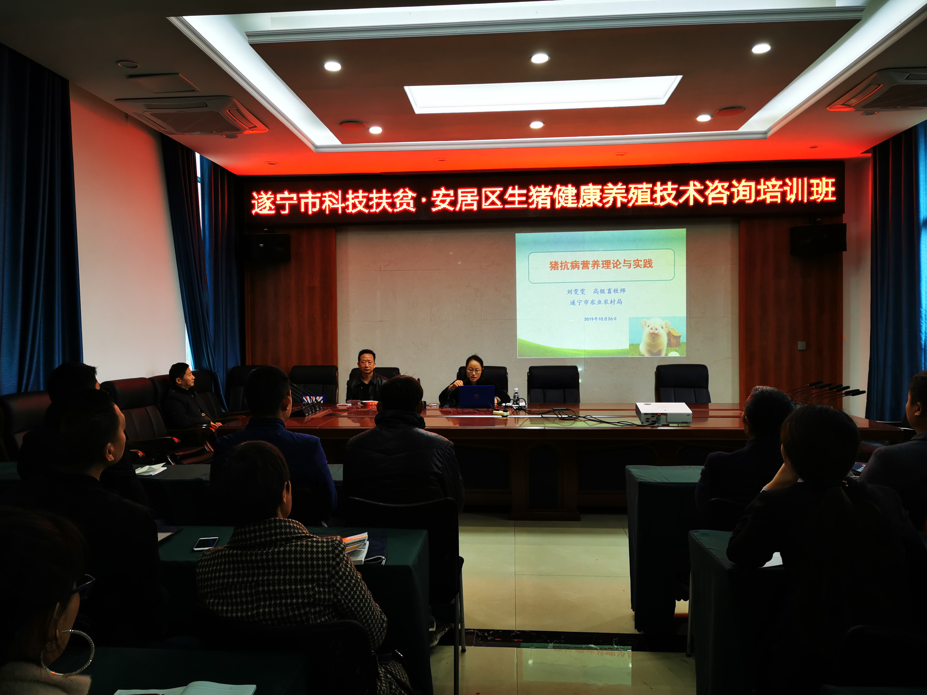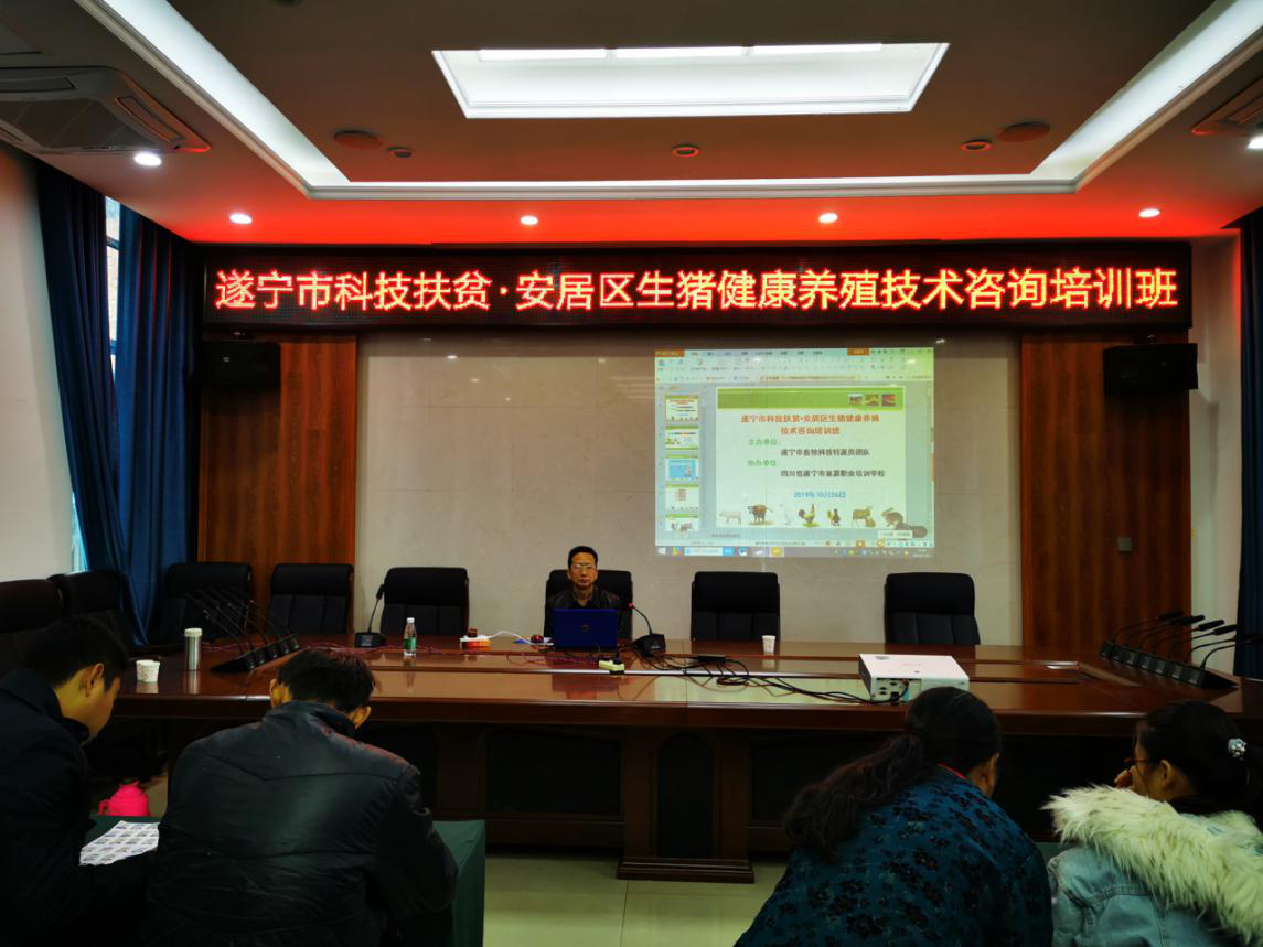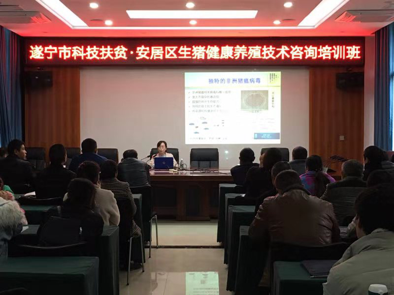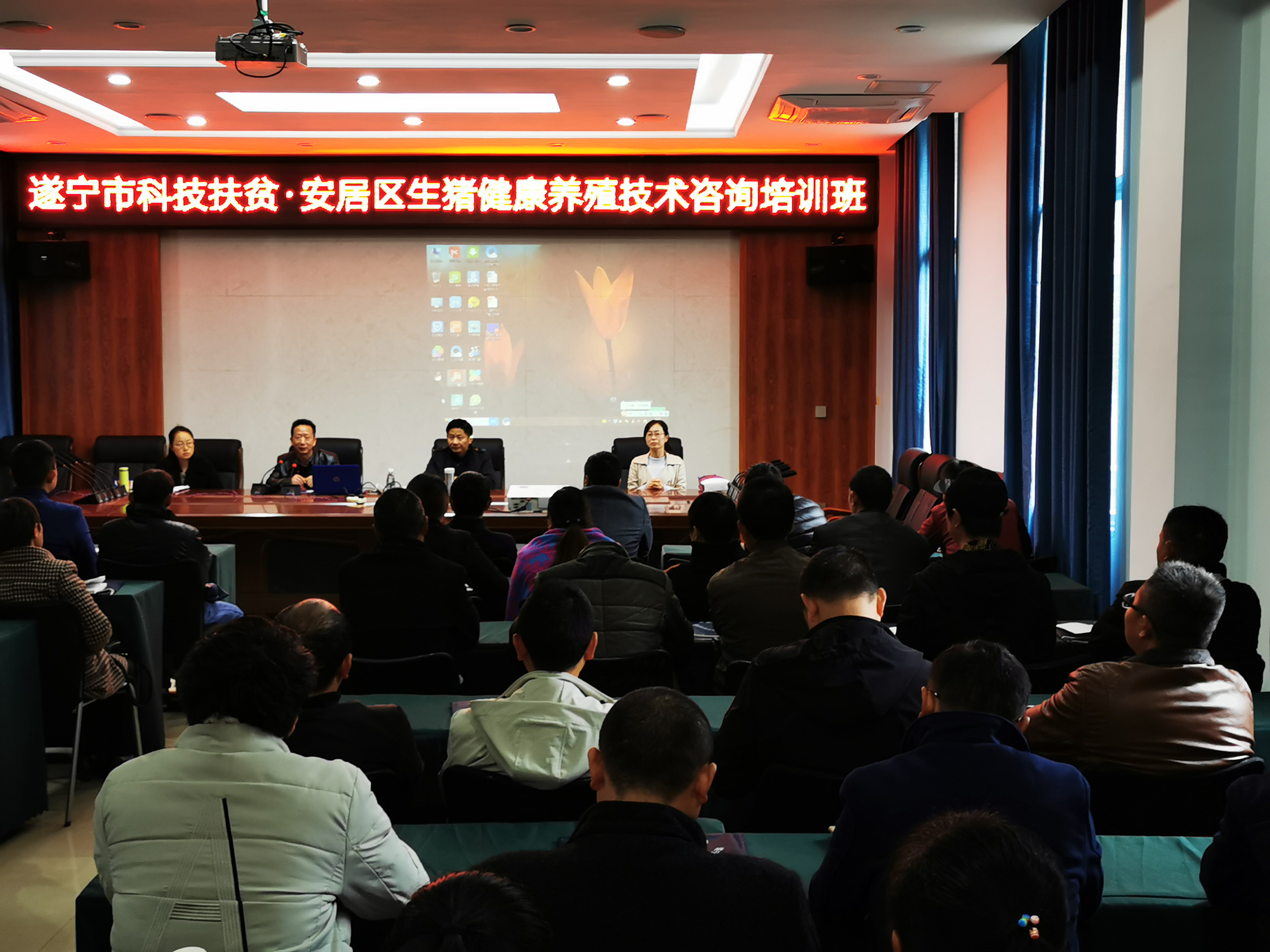 为了进一步落实安居区非洲猪瘟疫病防控和恢复生猪生产工作,提升全区生猪养殖场(户)对非洲猪瘟等动物疫病的防控水平和生猪健康养殖水平,遂宁市畜牧科技特派员团队在三家镇政府会议室举办了《遂宁市科技扶贫·安居区生猪健康养殖技术咨询培训班》培训活动,市科技特派员梁崇杰、尹念春、刘雯雯等畜牧兽医专家分别以《中小规模养猪场非洲猪瘟防控技术》、《非洲猪瘟防控及生猪复养技术》、《猪抗病营养的实践应用》、《绿色养殖·科学替抗》等主题为养殖户进行了技术讲解和咨询服务。