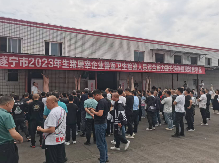此次培训就《生猪屠宰肉品品质检验规程(试行)》《畜禽屠宰操作规程 生猪》等开展理论教学,对《生猪屠宰管理条例》进行解读,并到遂宁市高金食品有限公司进行现场操作教学。