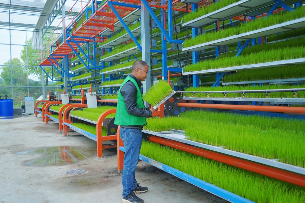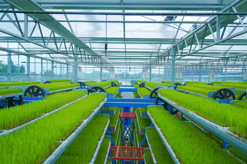 安居区三家大米育秧中心循环育秧架上秧苗长势喜人。安居区委宣传部供图